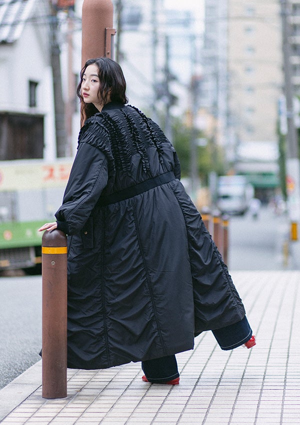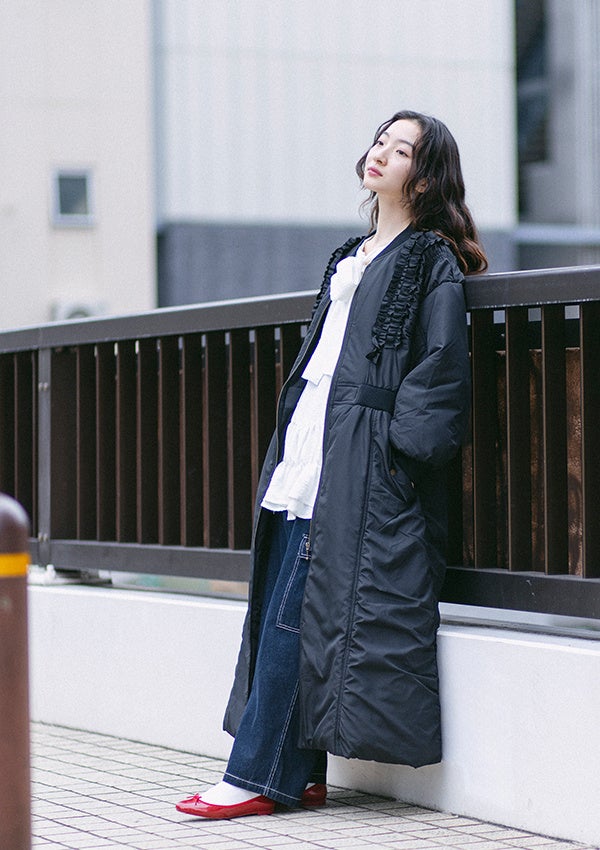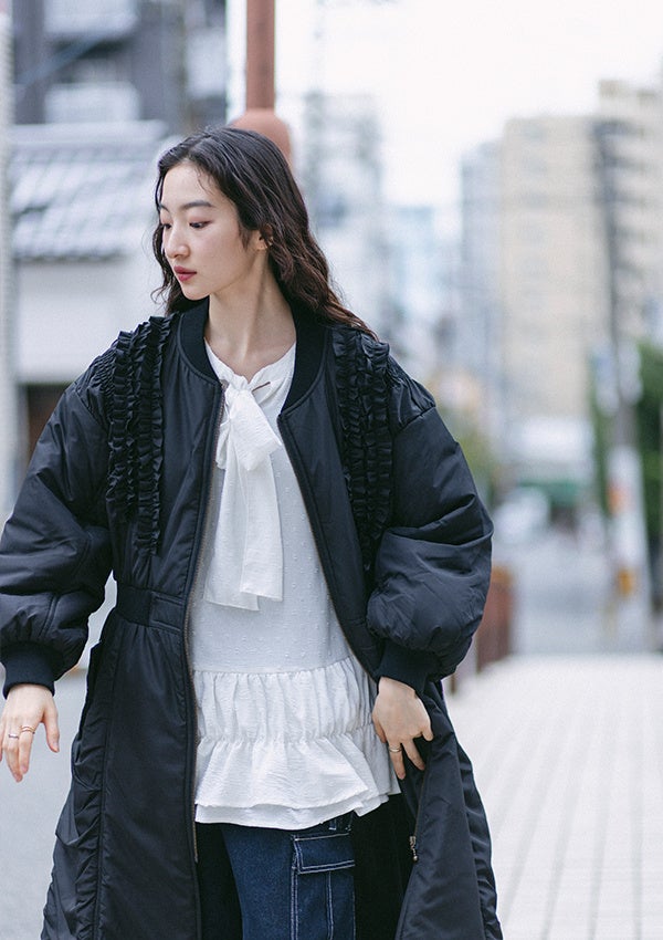 ミリタリーテイストなアイテムながらも、たっぷりのフリルとAラインシルエットで、1枚で“ロマンティックカジュアル”なスタイリングに。