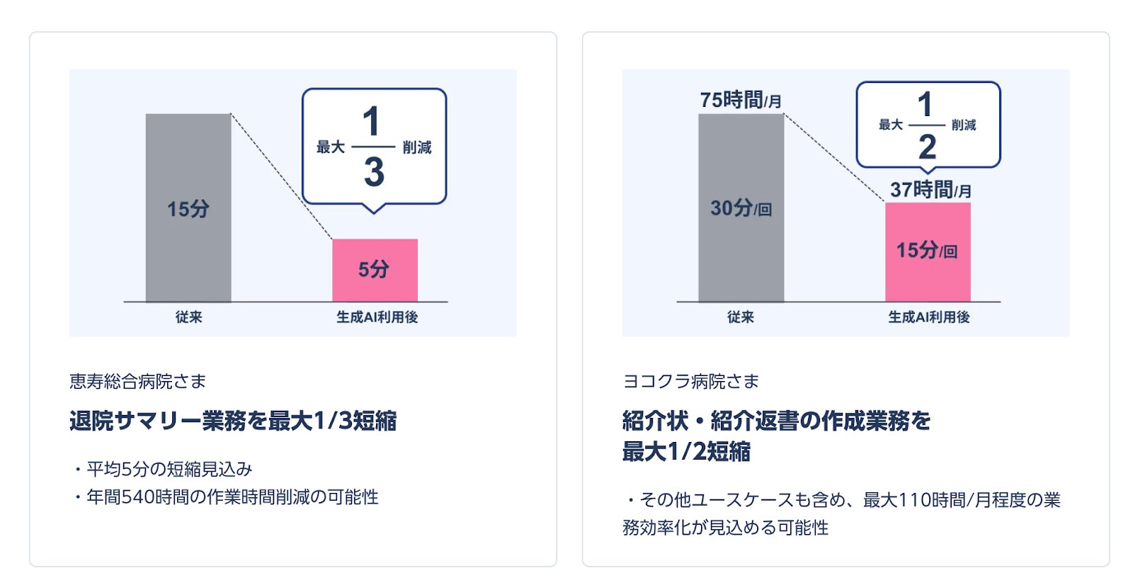 本サービスは2023年12月に実施した恵寿総合病院との生成AI活用に関する実証実験をはじめ、複数の協力医療機関との実証実験の結果を踏まえ提供開始することを決定したものです。恵寿総合病院との実証実験では書類作成業務の時間が最大1/3まで軽減できるなど(*1)、生成AIの活用が院内全体の業務効率化に寄与する可能性が示されています。