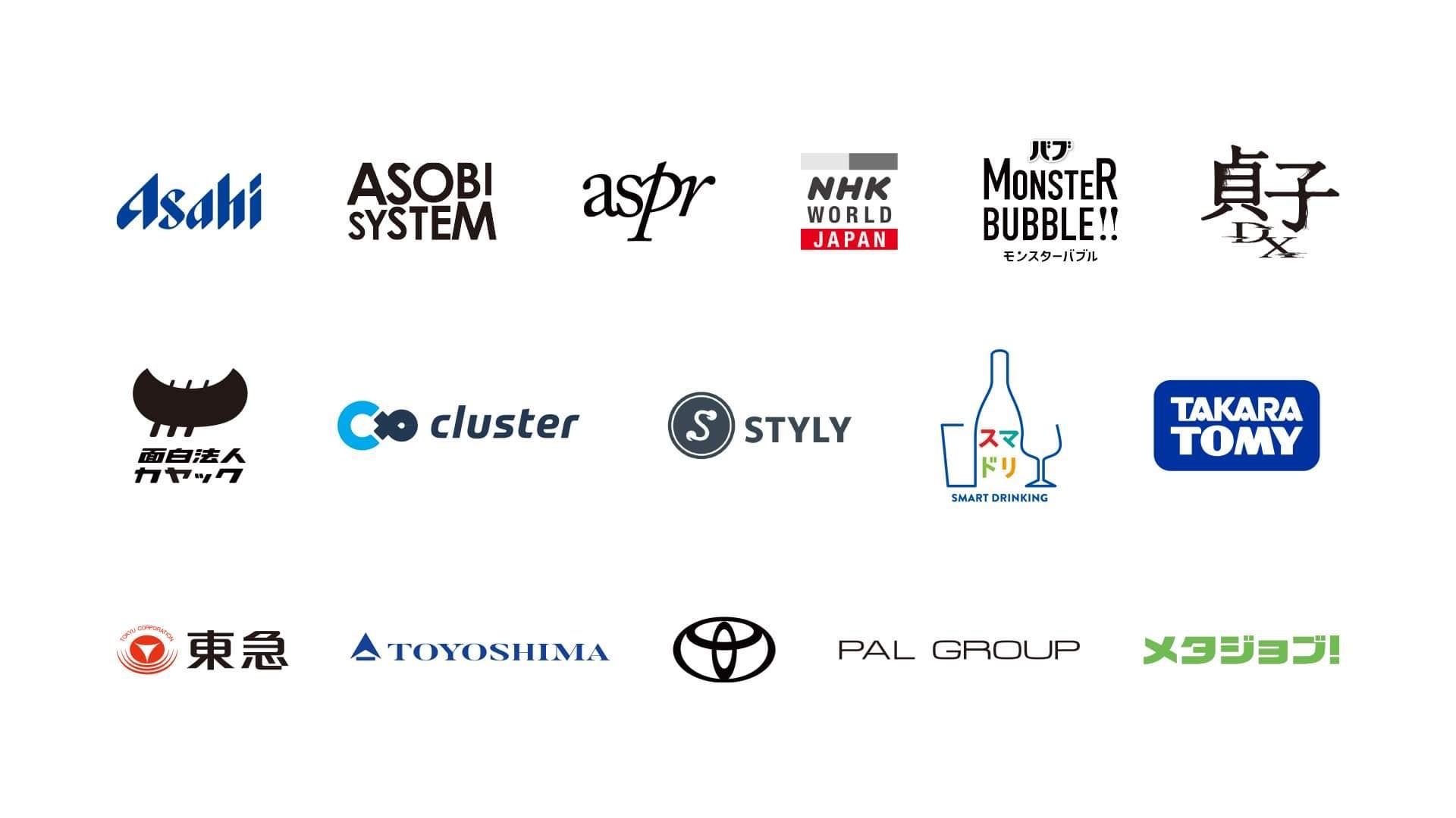 アサヒビール株式会社、アソビシステム株式会社、株式会社ASPR、NHKワールドJAPAN、花王株式会社(バブ MONSTER BUBBLE)、株式会社KADOKAWA(貞子DX)、株式会社カヤック、クラスター株式会社、株式会社Psychic VR Lab(STYLY)、スマドリ株式会社、株式会社タカラトミー、東急株式会社、豊島株式会社、トヨタ自動車株式会社、株式会社パル、Moon Creative Lab Inc.(メタジョブ!)※50音順
