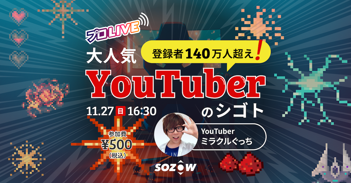 Go Visions株式会社(所在地:東京都品川区、代表取締役:小助川 将)が運営する小・中学生向けオンラインの学び場「SOZOW(ソーゾウ)」は、11月27日(日)に、YouTuberのミラクルぐっちさんをゲストにお迎えし、「YouTuberのシゴト」について子どもたちが話を聞ける特別イベントを開催いたします。