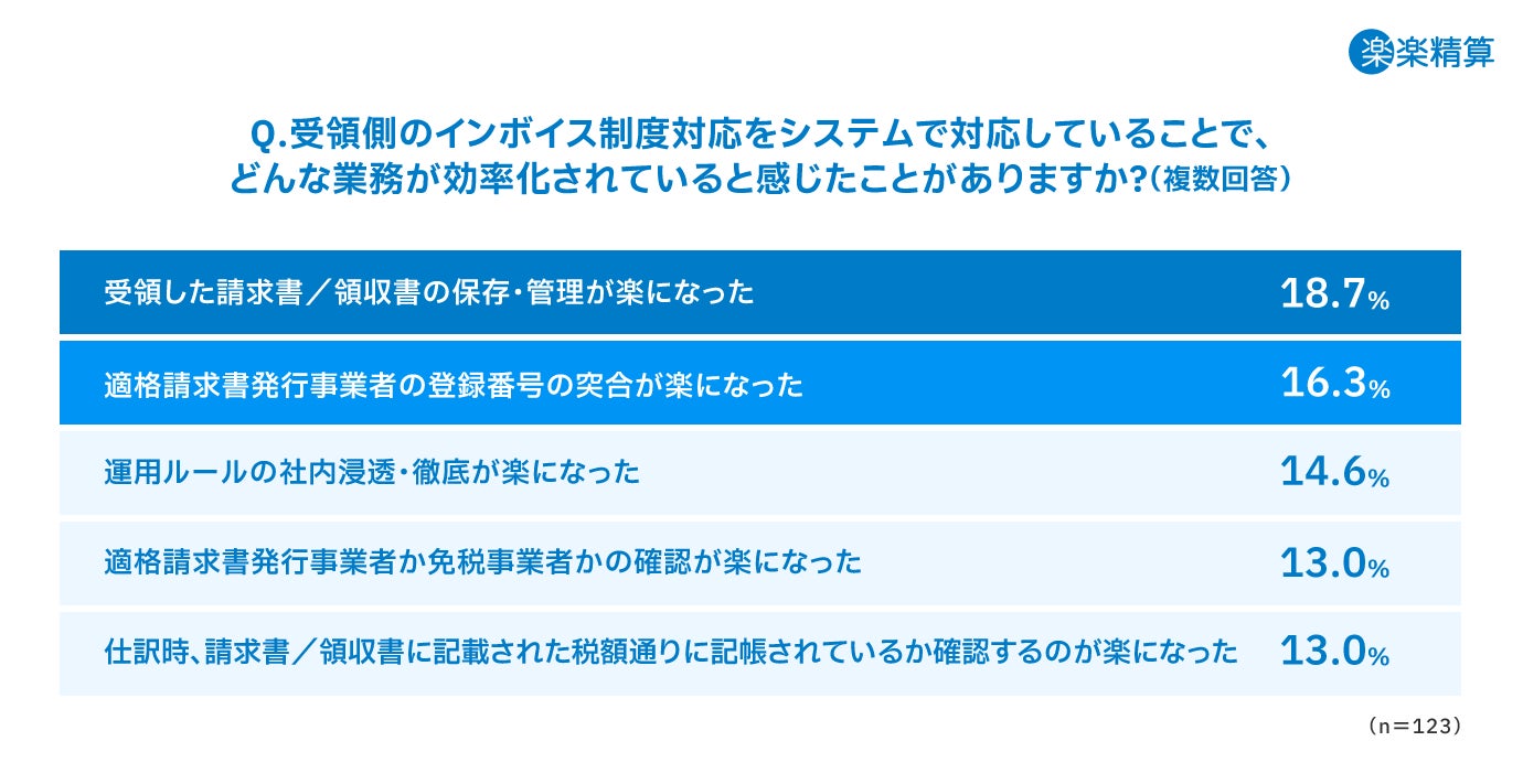 どのような業務が効率化されたのか伺ったところ「受領した請求書/領収書の保存・管理が楽になった」が18.7%と最多に。次いで「適格請求書発行事業者の登録番号の突合が楽になった」が16.3%となり、“システムを利用せずに受領側のインボイス制度に対応している層”が課題と感じているインボイス制度対応で発生する確認業務が効率化できていることが伺えます。