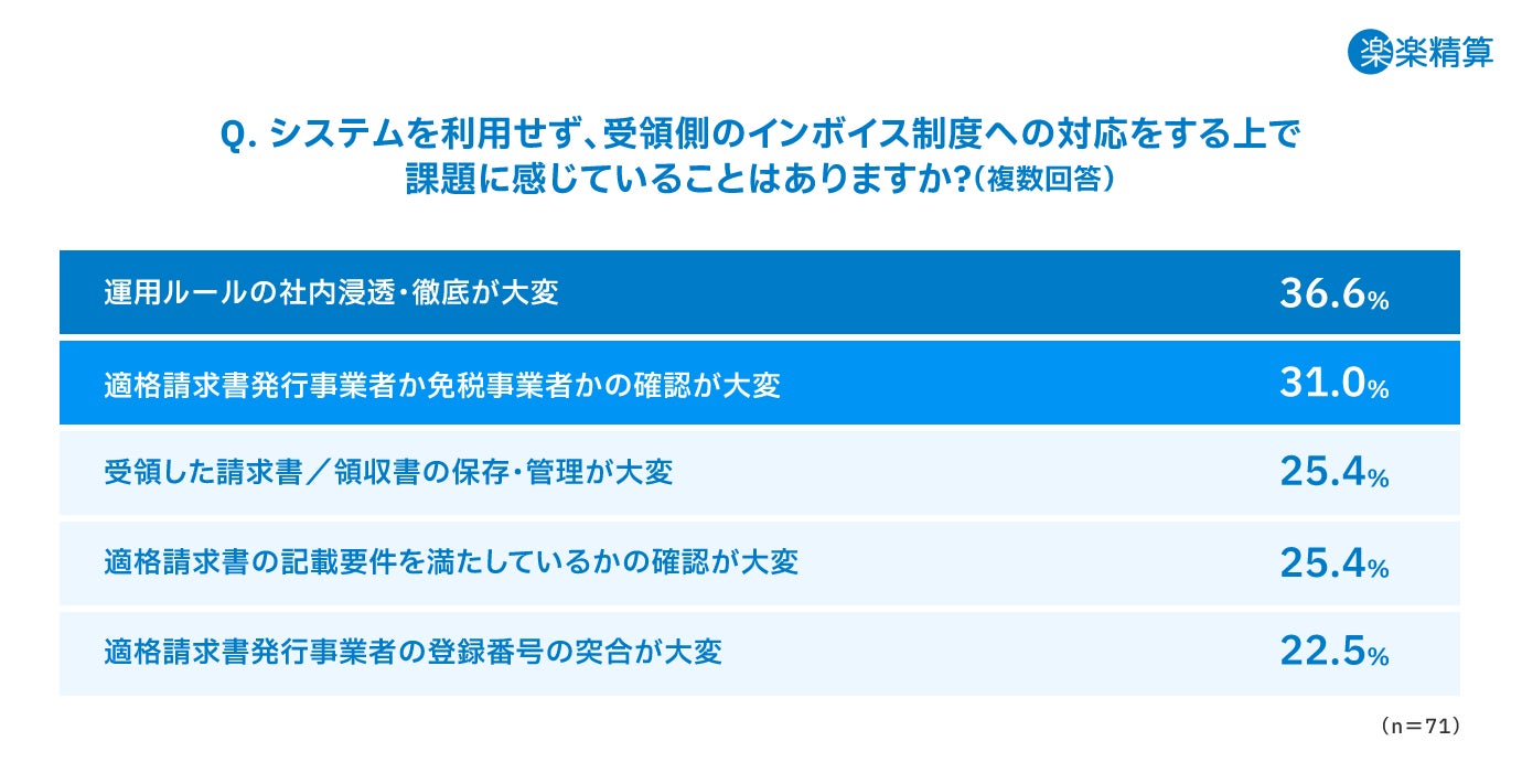 受領側のインボイス制度にシステムを利用せず対応していると回答した企業に課題を伺ったところ、「運用ルールの社内浸透・徹底が大変」が36.6%と最多となりました。次いで「適格請求書発行事業者か免税事業者かの確認が大変」が31.0%を占め、“社内規定に沿った申請かどうか”の確認や“適格請求書発行事業者の登録番号(T番号)の確認”など、インボイス制度で発生する確認業務が負担になっていることが明らかになりました。