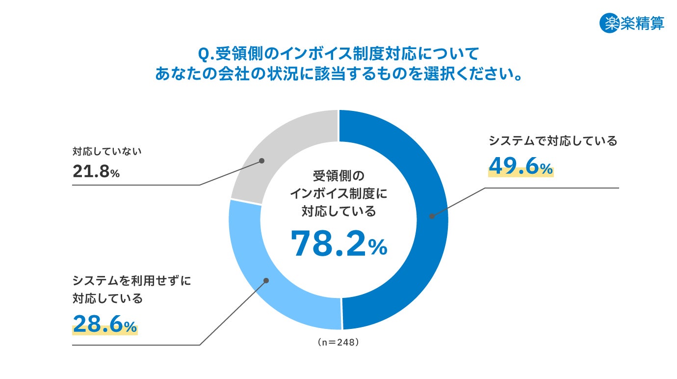受領側のインボイス制度の対応率は、78.2%と過半数が対応しており、多くの企業が対応済みであることがわかりました。「システムで対応している」と回答した割合は49.6%、「システムを利用せずに対応している」と回答した割合は28.6%と、システムで対応している割合が多くなっています。