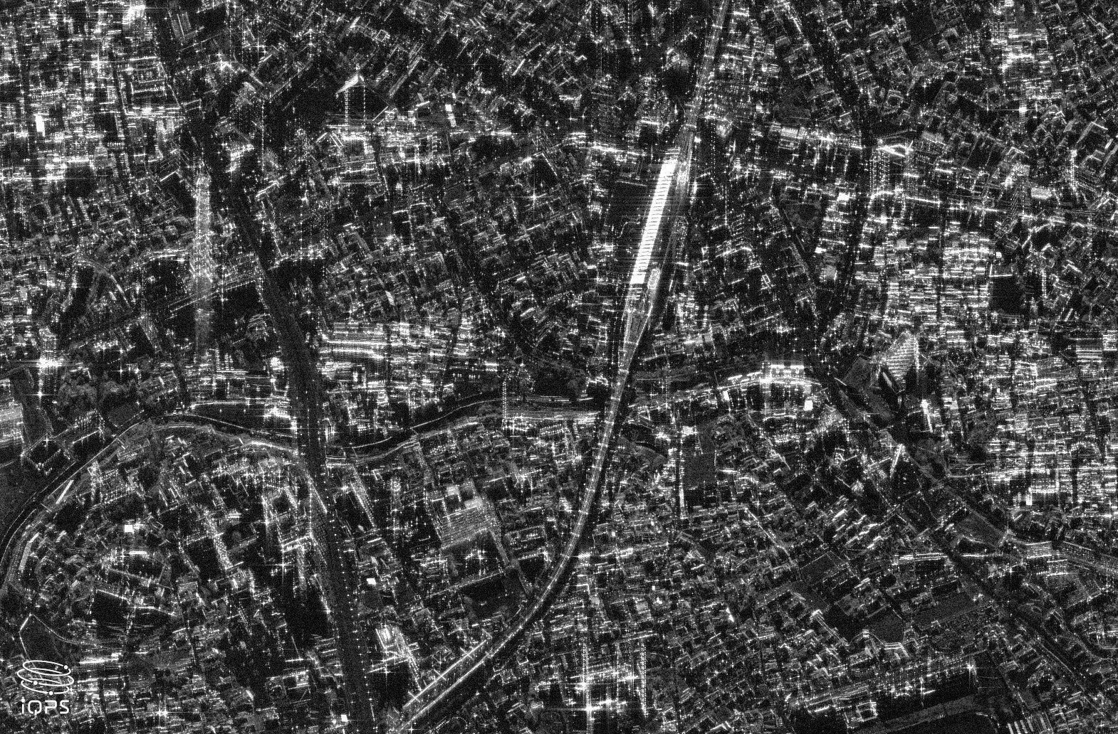 QPS-SARは分解能1.8mの通常モード(ストリップマップモード)と分解能46cmの高精細モード(スポットライトモード)の観測が可能です。今回、10号機は6月6日(金)に高精細モードで初観測を行いました。今週6月12日(木)打上げ予定の11号機「ヤマツミ-Ⅰ」の初期運用が控えていることもあり、それに先立って10号機の最新状況をお伝えしたく、初で観測した1枚をファーストライト画像として発表いたします。
