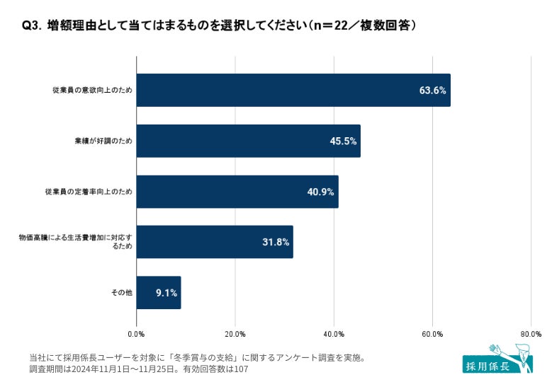 もっとも多かったのは「従業員の意欲向上のため」で、63.6%が回答。2位は「業績が好調のため」(45.5%)、3位には「従業員の定着率向上のため」(40.9%)が続きました。