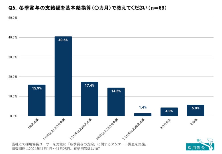 Q1で「支給する」と回答した事業所(n=69)へ、賞与支給額(基本給換算〇カ月)について質問したところ、40.6%が「1カ月以上1.5カ月未満」と回答しています。