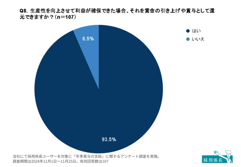 その結果、93.5%が「はい(=賃上げまたは賞与として還元できる)」と回答。今冬の支給予定は7割未満でしたが、支給しない事業所を含めた大半が従業員への利益還元を考えていることが読み取れます。