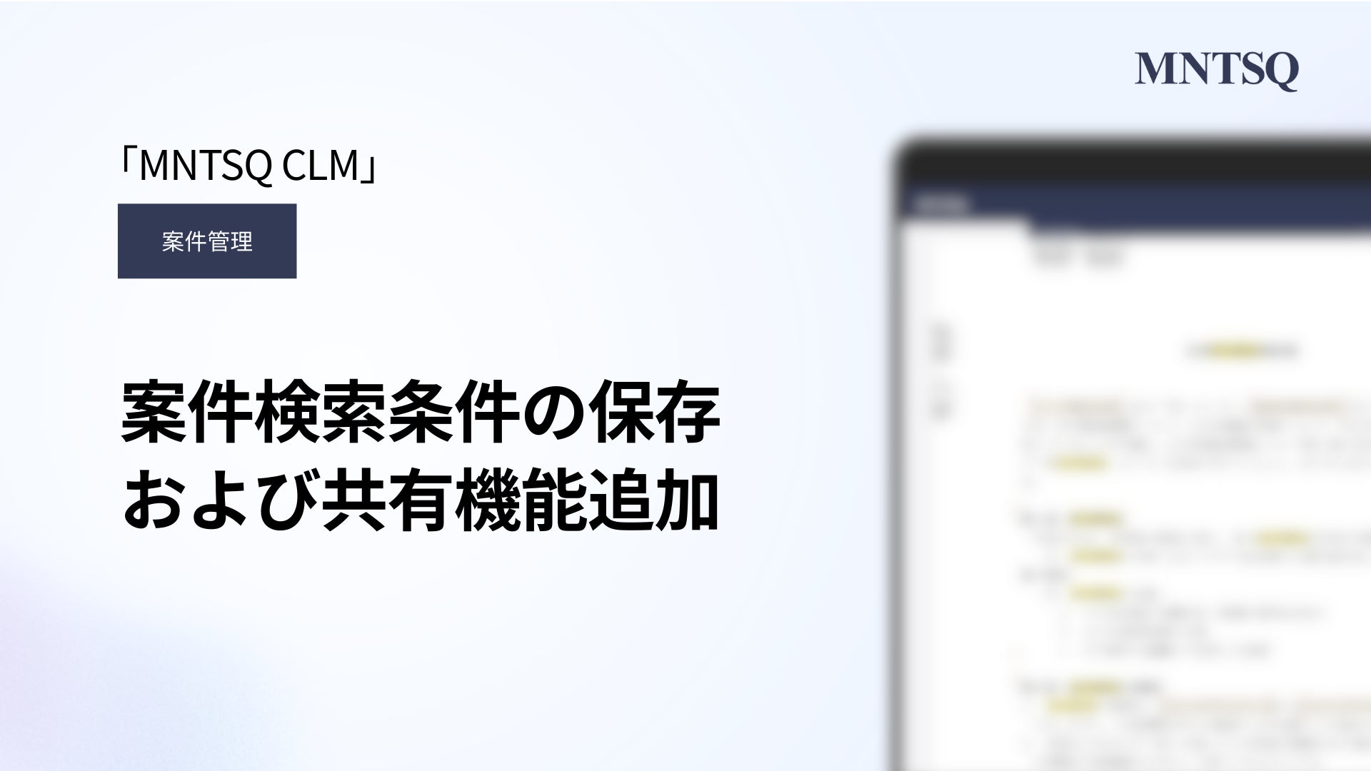 「すべての合意をフェアにする」をビジョンに掲げるMNTSQ(モンテスキュー)株式会社(本社:東京都中央区、代表取締役:板谷 隆平、以下「MNTSQ」)は、「MNTSQ CLM」の「案件管理」に、案件の絞り込み条件を保存および共有できる機能を追加したことをお知らせします。