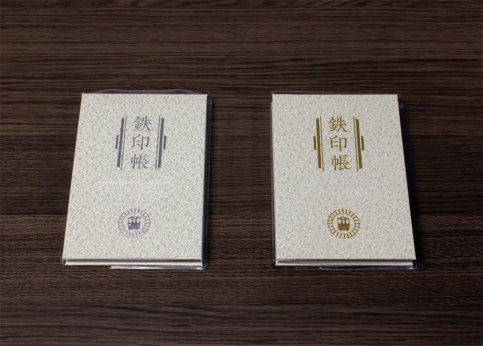 5周年記念の特別版は、表紙に光沢のある模様をあしらった生地を使用し、それぞれ金の箔押し、銀の箔押しをした煌びやかなものになっています。今回は特別に汚れ防止のビニールカバーと“鉄道愛”と揮毫された鉄印をセットにして販売いたします。
