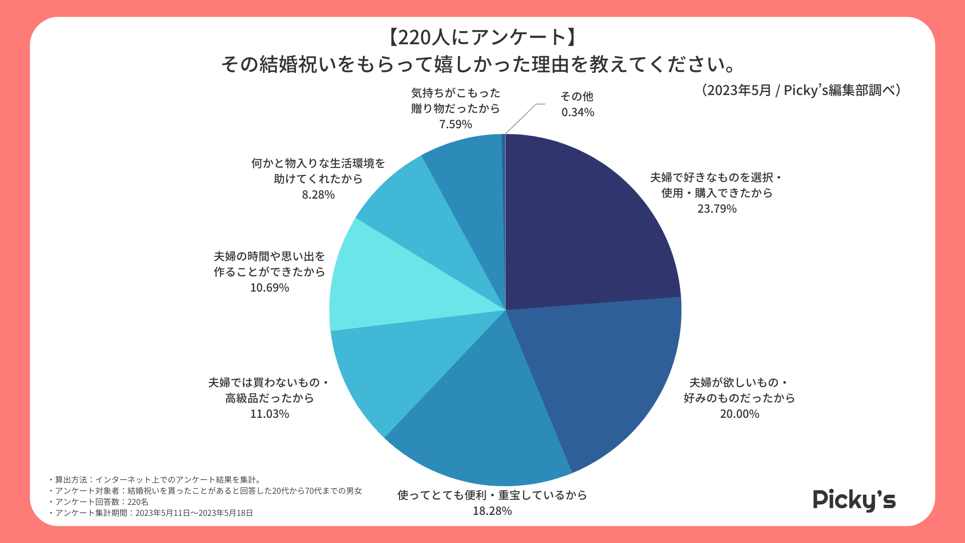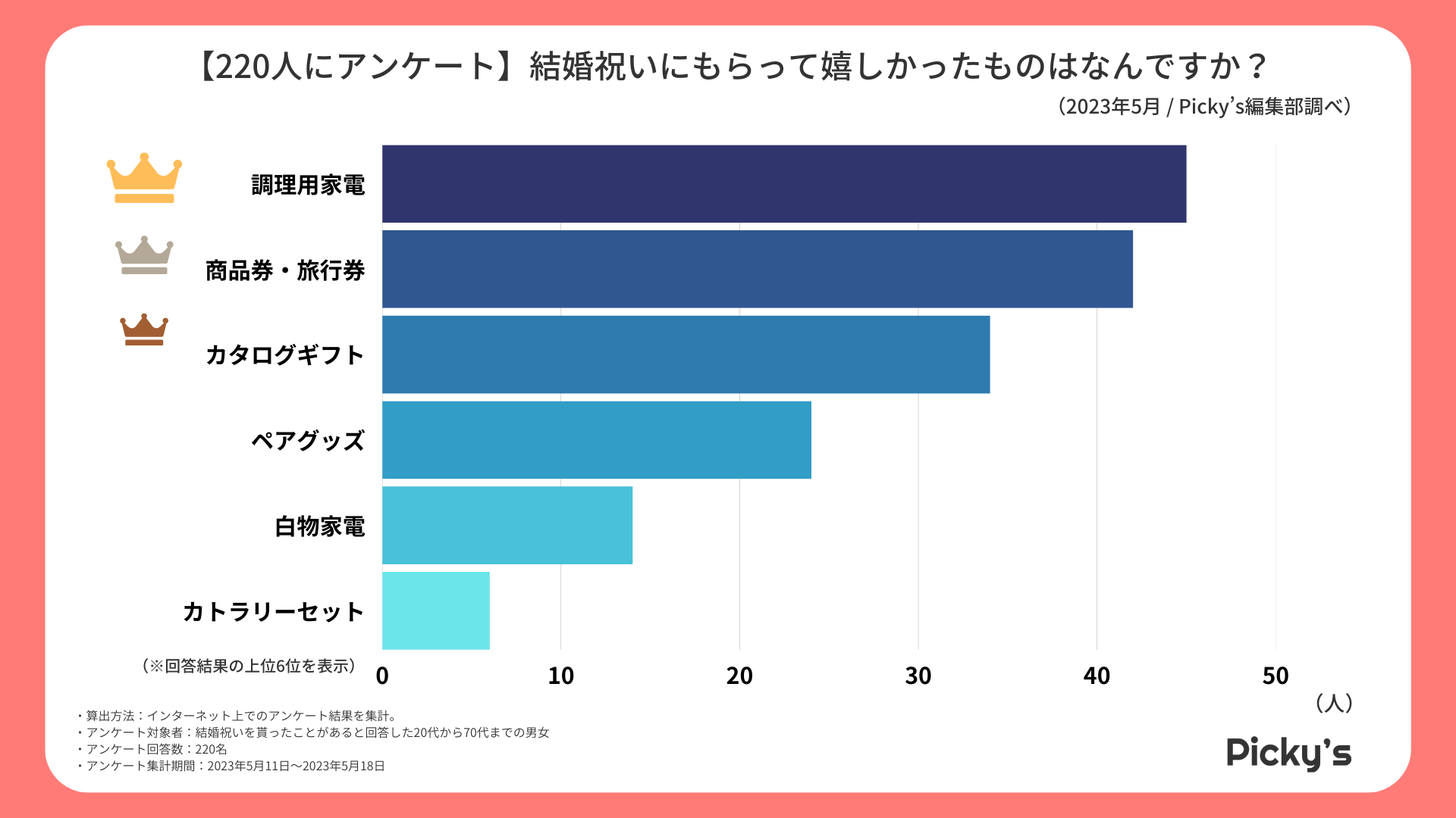 「Picky’s」は、インターネットショッピングにおいて、購入前に試せない・選ぶべきものがわからないという課題の解決を目標に、あらゆる商品のおすすめランキングや検証レビューを紹介するサイトです。このたびPicky’s(https://rentry.jp/note/)では、結婚祝いで何をもらって嬉しかったかについてインターネット上でアンケート調査を行いましたので発表いたします。