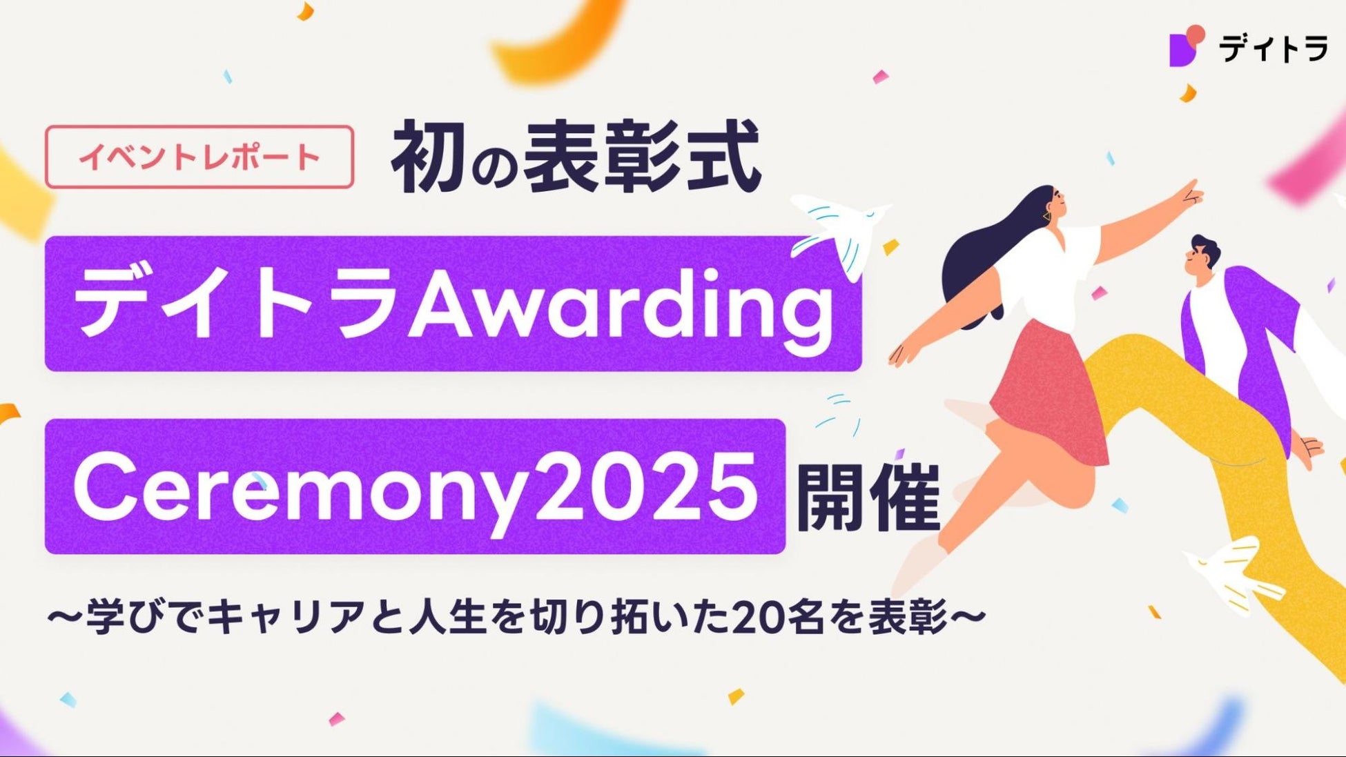 株式会社デイトラ(本社:東京都豊島区、代表取締役:大滝昇平、以下「デイトラ」)は、2025年4月5日(土)、創業5周年を記念した初の受講生表彰イベント「デイトラ Awarding Ceremony 2025」を日比谷スカイカンファレンスにて開催しました。全国から受講生や関係各社など200名以上が来場し、デイトラでの学びによってキャリアやライフスタイルを大きく変えた20名の受講生を表彰。ゲストによるトークセッションや懇親会も実施され、会場は終始活気に包まれました。