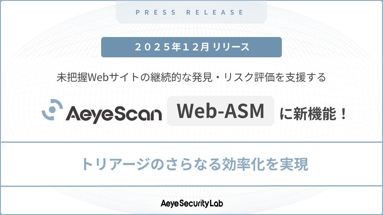 クラウド型Webアプリケーション脆弱性診断ツール「AeyeScan」を提供する株式会社エーアイセキュリティラボ(https://www.aeyesec.jp/ 東京都千代田区 代表取締役社長:青木 歩)は、2024年11月のリリース以来、多くのお客様にご導入いただいている「Web-ASM機能」オプションに生成AIを活用した新機能を追加し、12月6日(土)より提供を開始しました。
