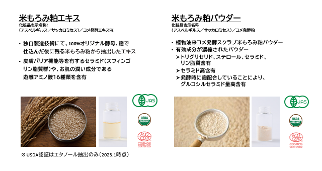 また、同じく有機JAS認証のオーガニック米を発酵し抽出される発酵粕をもとに、植物由来の溶媒で抽出したエキス原料や、フリーズドライ製法でパウダー化した原料などをオーガニック米由来の発酵原料として展開しています。これらの原料は、セラミドやアミノ酸を多く含むため、肌を保湿し、バリア機能をサポートしてくれる働きがあります。