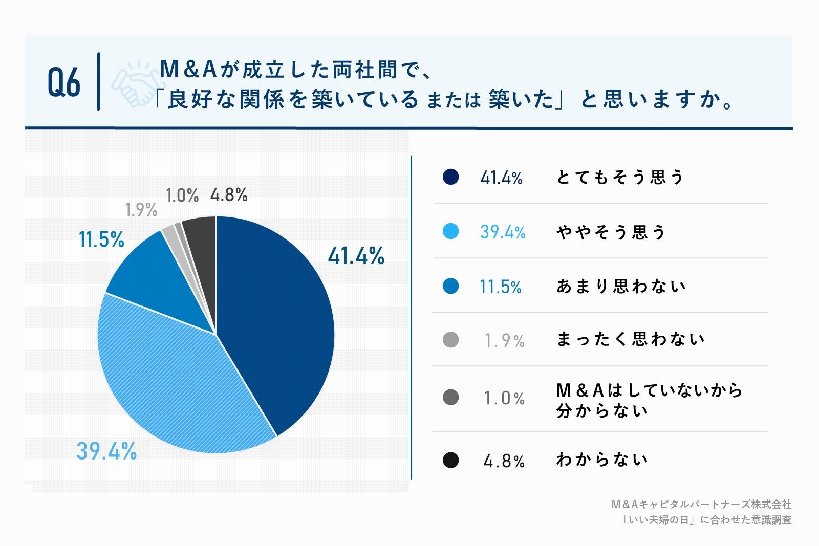 「Q6.M&Aが成立した両社間で、良好な関係を築いている/築いたと思いますか。」(n=104)と質問したところ、「とてもそう思う」が41.4%、「ややそう思う」が39.4%という回答となりました。
