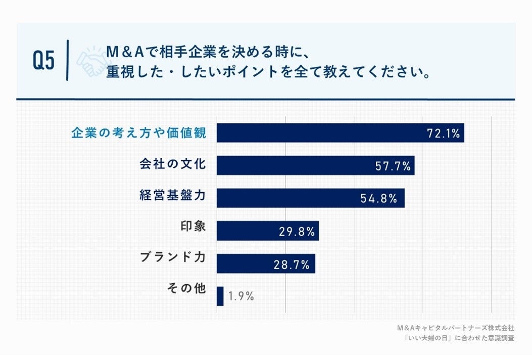 「Q5.M&Aで相手企業を決める時に、重視した/したいポイントを全て教えてください。(複数回答)」(n=104)と質問したところ、「企業の考え方や価値観」が72.1%、「会社の文化」が57.7%、「経営基盤力」が