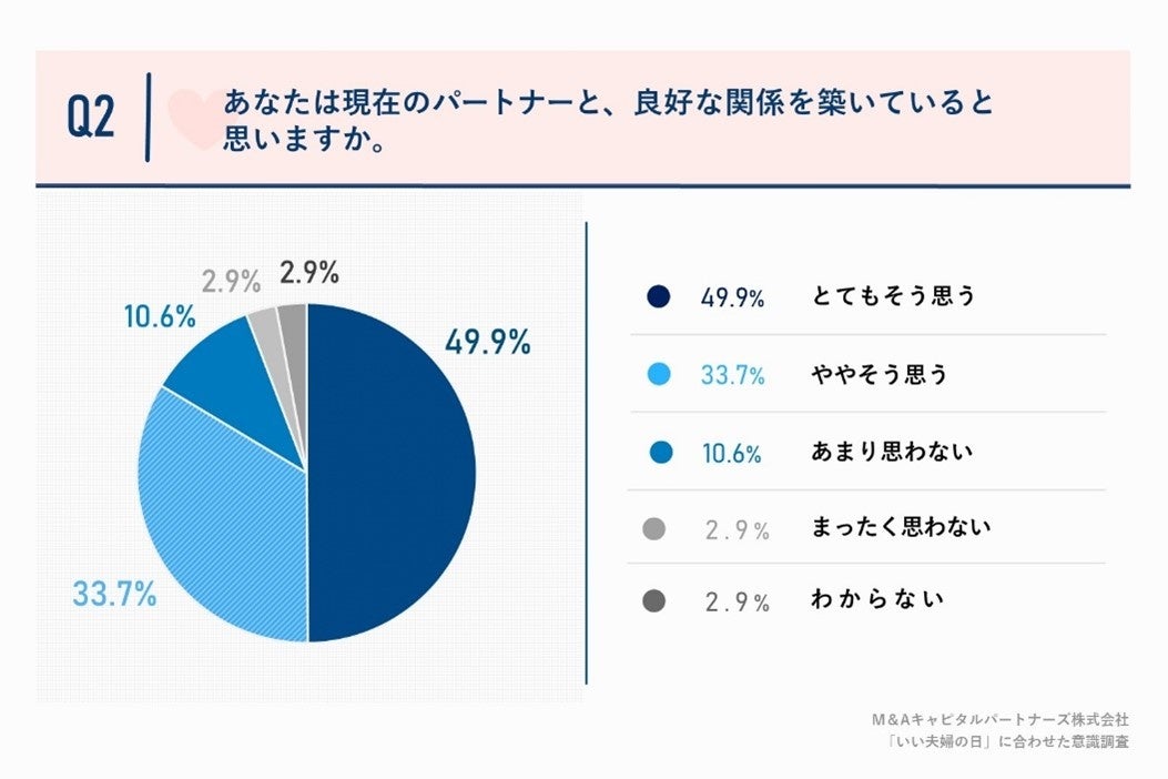「Q2.あなたは現在のパートナーと、良好な関係を築いていると思いますか。」(n=104)と質問したところ、「とてもそう思う」が49.9%、「ややそう思う」が33.7%という回答となりました。