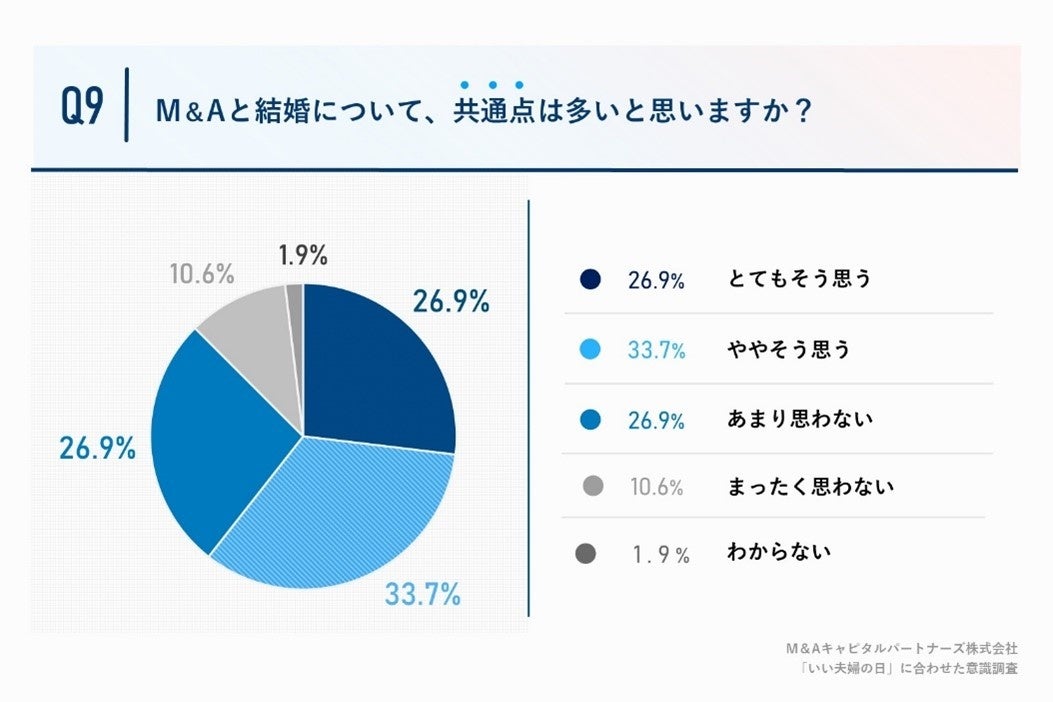 「Q9.M&Aと結婚について、共通項は多いと思いますか。」(n=104)と質問したところ、「とてもそう思う」が26.9%、「ややそう思う」が33.7%という回答となりました。