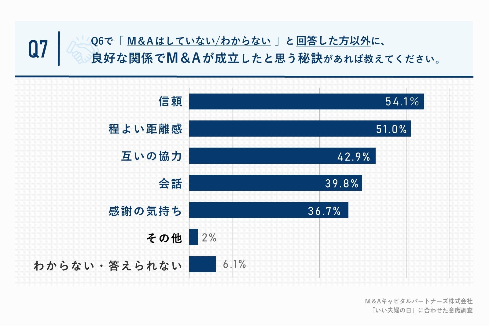 Q6で「M&Aはしていない/わからない」と回答した方以外に、「Q7.良好な関係でM&Aが成立したと思う秘訣があれば教えてください。(複数回答)」(n=98)と質問したところ、「信頼」が54.1%、「程よい距離感」が51.0%、「互いの協力」が42.9%という回答となりました。