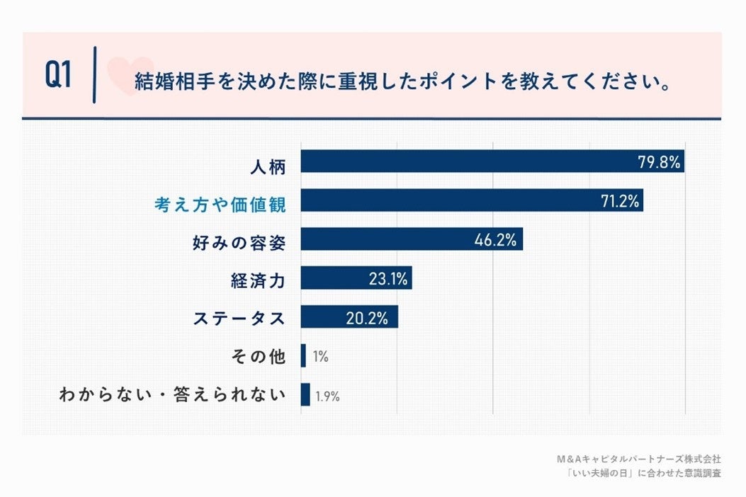「Q1.結婚相手を決めた際に重視したポイントを教えてください。(複数回答)」(n=104)と質問したところ、