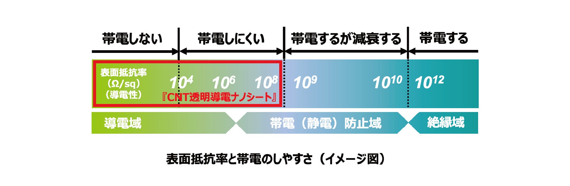 『CNT透明導電ナノシート』の構造は、基材とCNT導電フィルム(CNT膜)(厚み1μm以下)の間に、水溶性膜を挟むことで形成されており、これを水に浸漬することで基材からCNT導電フィルムが剥離します。そして機能を付与したい対象物に剥離したCNT導電フィルムを転写することで導電性を付与することができます。また、表面抵抗率はCNT導電フィルムの膜厚を変えることで10²~10⁸Ω/sq(※3)までの調整が可能です。