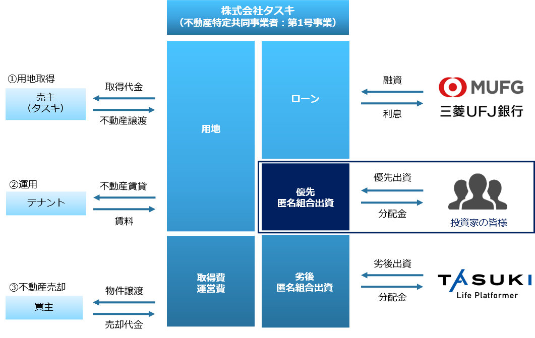 優先劣後方式により、投資家の皆様へは優先出資分として180口を募集します。一方、当社は50口を劣後出資で行います。万一、損失が発生した場合、当社が先に損失部分を負担しますので、投資家の皆様は、当社より優先して出資金の返還を受けることができます。