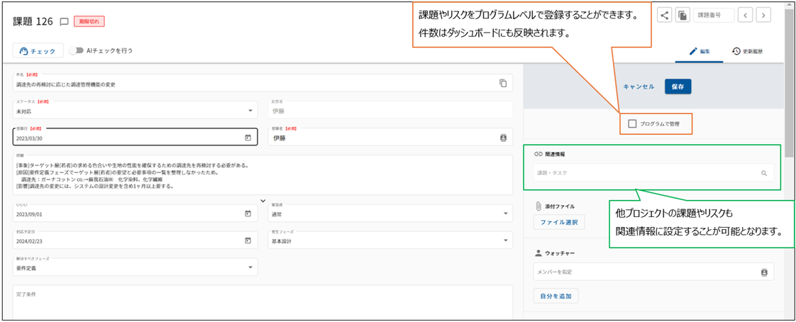 今回のアップデートに伴い、特定のプロジェクトに限定しない「プログラム課題/リスク」の管理ができるようになりました。これにより、プログラムマネージャーやプログラムマネジメントオフィスが推進する組織的な課題やリスクをもれなく管理することができるようになります。また、あるプロジェクトで管理する課題やリスクを、他のプロジェクトに関連情報として設定することができ、課題やリスク対応の横展開を促進することを支援致します。