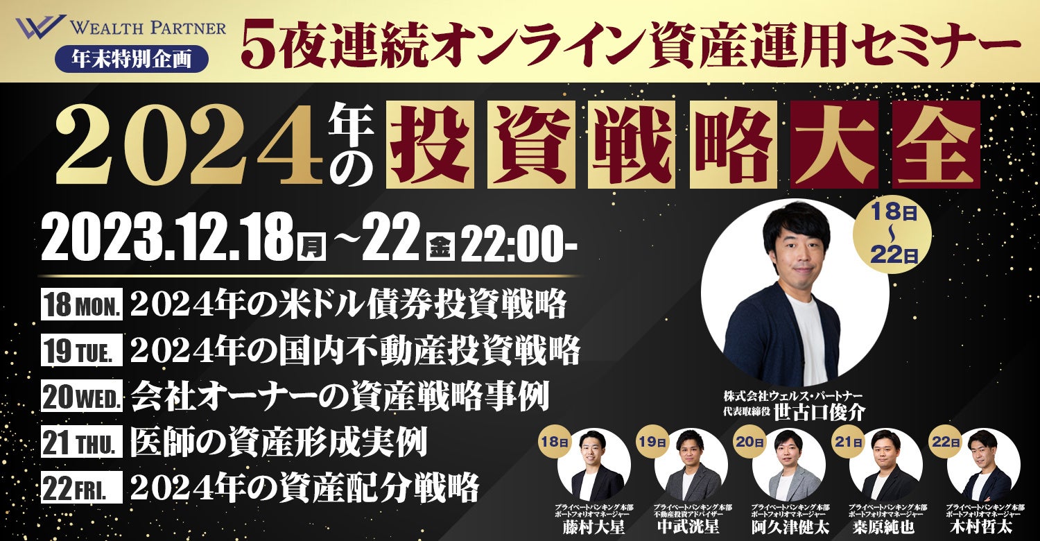2023年12月18日から22日の22時から5夜連続オンラインで資産運用セミナー「2024年の投資戦略大全」を開催いたします。各セミナー参加費無料のセミナーとなります。