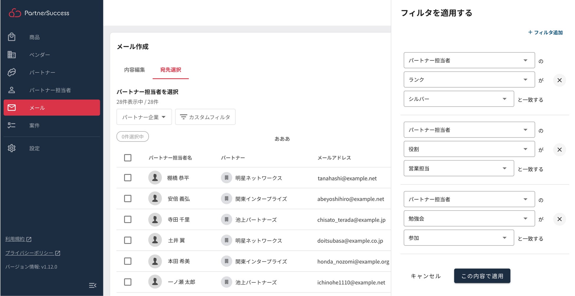 代理店販売で業績を伸ばすPRM(※1)-代理店連携管理クラウド「PartnerSuccess」を開発運営するパートナーサクセス株式会社(本社:東京都渋谷区、代表取締役 永田雅裕、以下「パートナーサクセス」)は、代理店への1to1メール配信機能内に、宛先を担当者個人の『代理店のランク』『保有資格』など細かくセグメント分けできる「カスタムフィルタ機能」を実装しました。