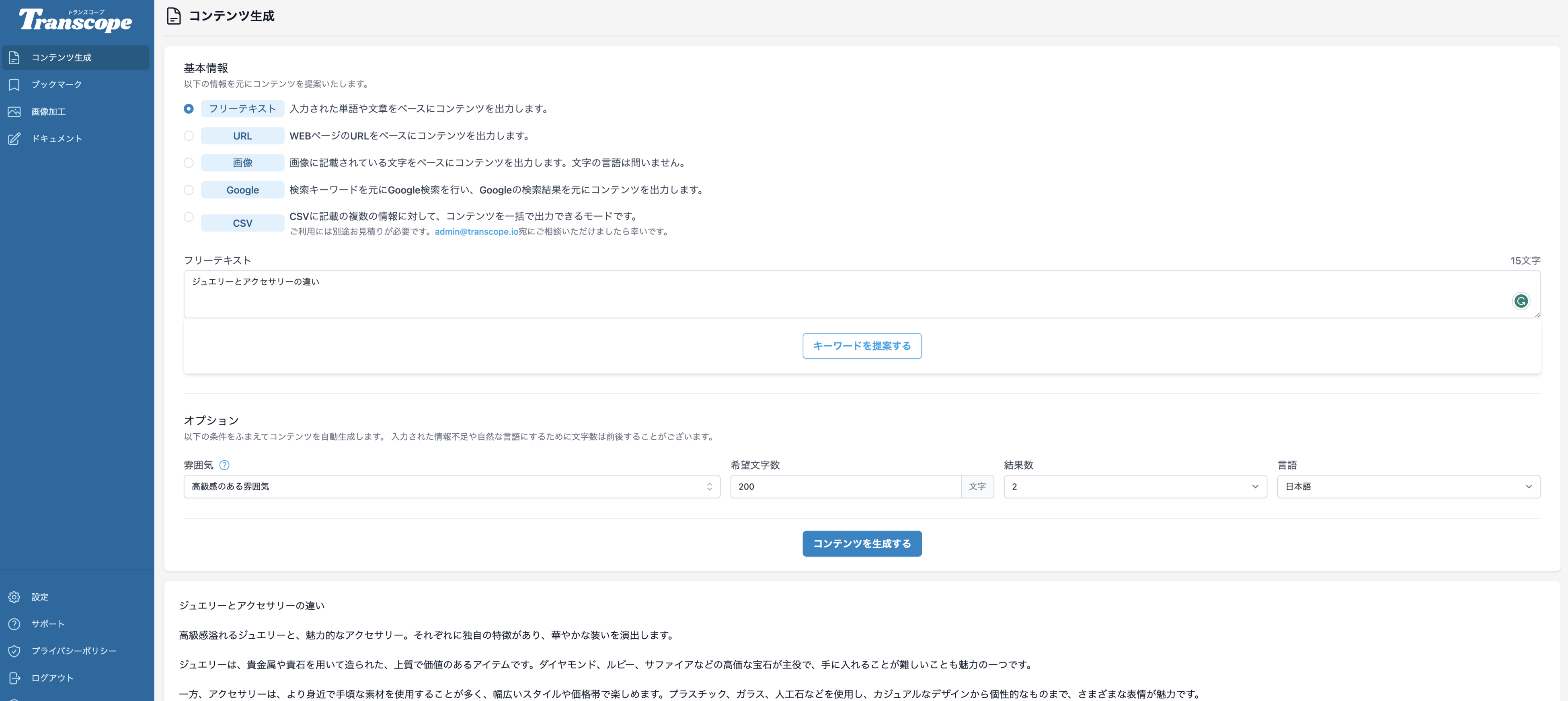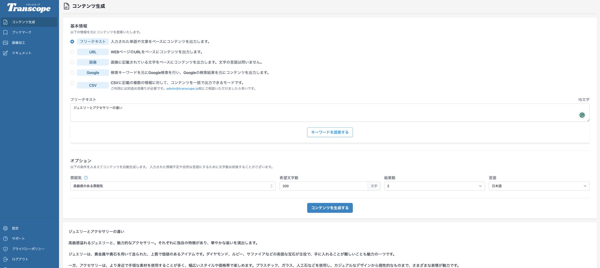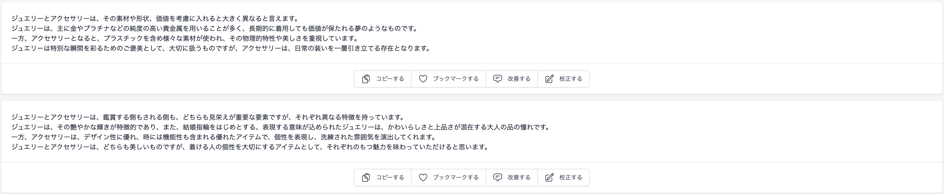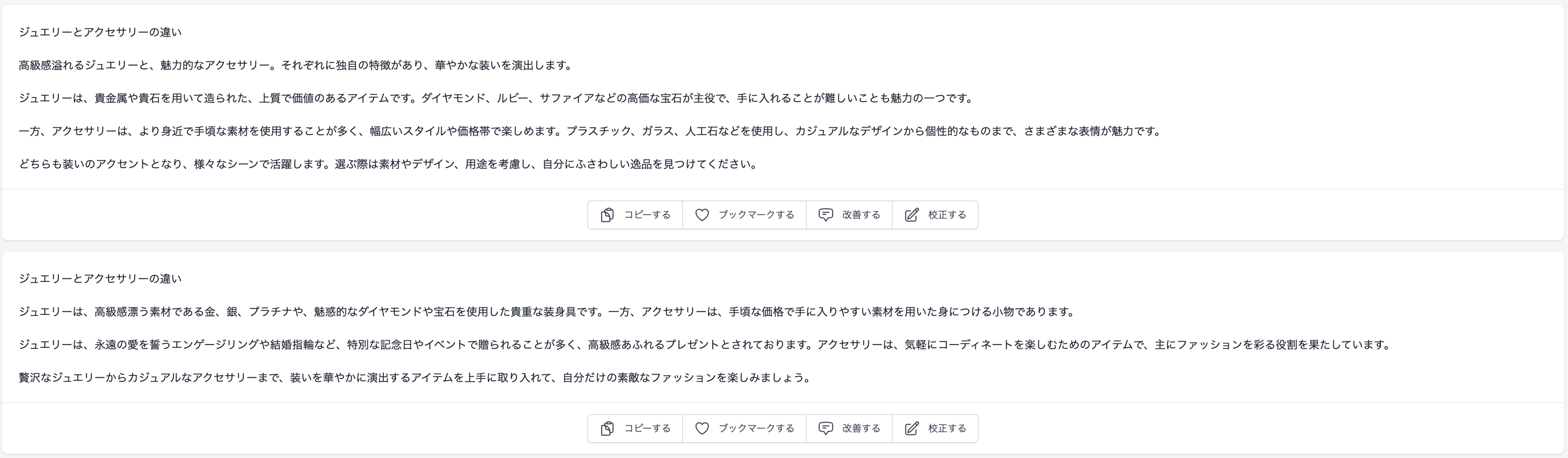 実際に以下は弊社Transcope(トランスコープ)において、高級感のある雰囲気で、ジュエリーとアクセサリーの違いについて文章を書かせた出力例になります。