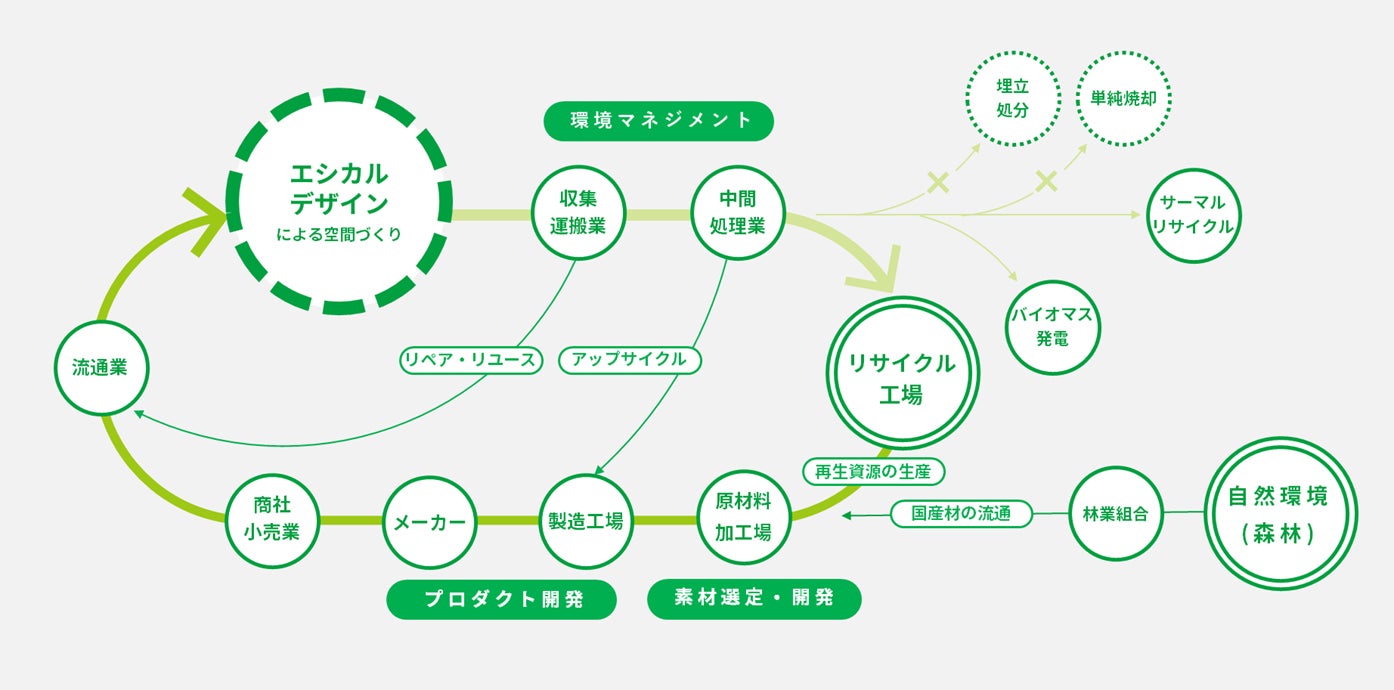 エシカルデザインの推進に先立ち、これまで役割毎に分断されていた内装業界の構造(サプライチェーン)を図解化しました(下図)。そこにリサイクルやリユース・アップサイクルなどの循環の流れを加えることで、エシカルデザインを実現するための対話先や共創の組み合わせのアイデアが生まれました。