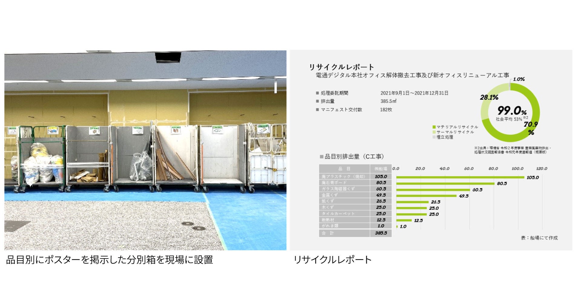 さらに、一部の案件では中間処分以降のパートナーと連携したトレーサビリティにも取り組んでおり、オフィスリニューアルなどで排出した廃棄物の再資源化量を「リサイクルレポート」として算出し顧客に提供しています。船場では、空間をただつくるだけではなく、環境面にも配慮した価値をパートナーとともに創出しています。