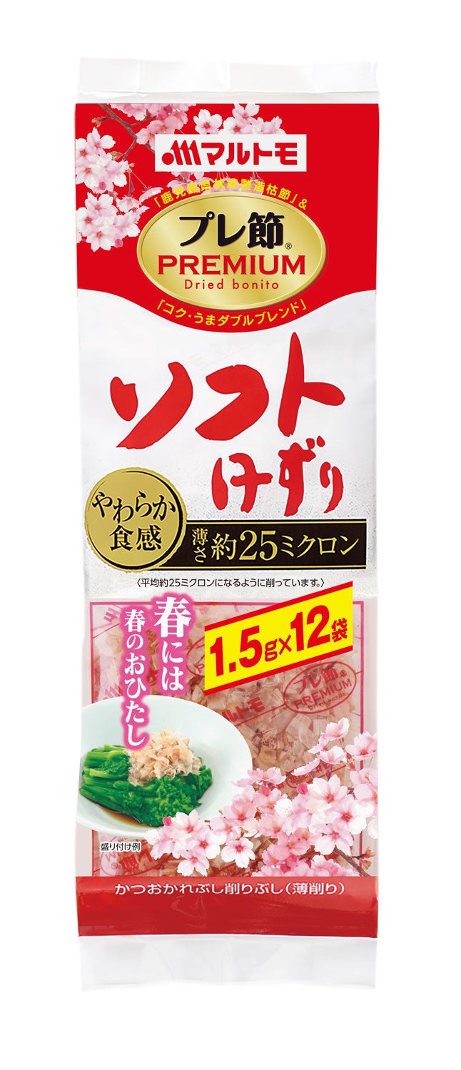 満開の桜をイメージしたデザインで、季節感と特別感で売場や食卓を演出し、春の豊かな食生活のご提案と「プレ節®」ブランドのさらなる価値向上を図ってまいります。マルトモ「プレ節®」は鹿児島県枕崎製造の2種類のプレミアムなかつお枯節を原料に使用し、薄さ約25ミクロンに薄く削りブレンドした「コク・うまダブルブレンド」。薄く削っているのでふわふわっとしたやわらか食感が特長の削りぶしです(25ミクロン=0.025㎜)。