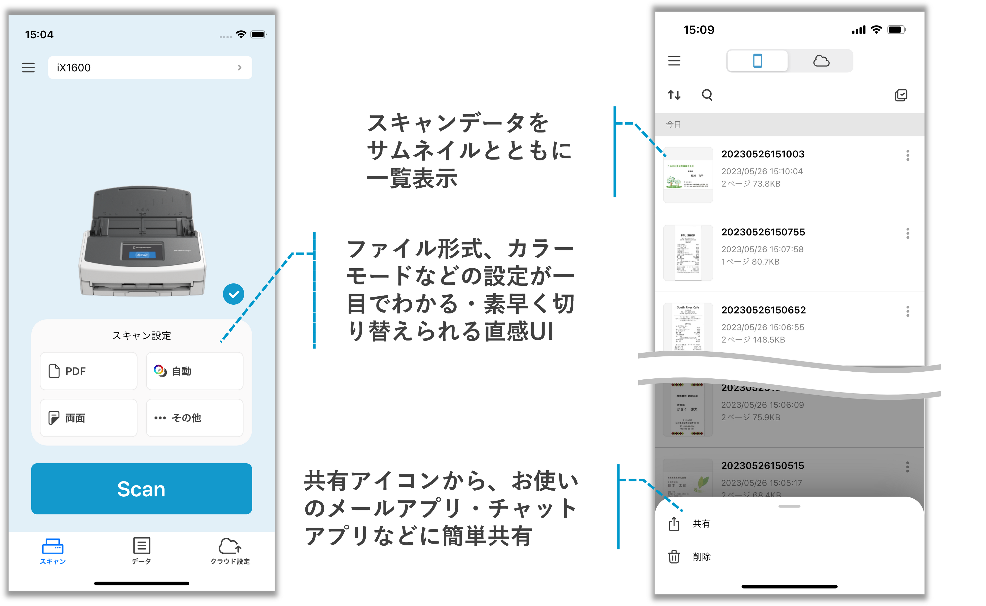 スキャンしたデータは、スマートフォンの共有アイコンをタップすれば、いつもお使いのチャットアプリやショートメッセージ、SNSアプリなどに簡単連携。家族や友人との共有もスマートフォン一つで完結します。