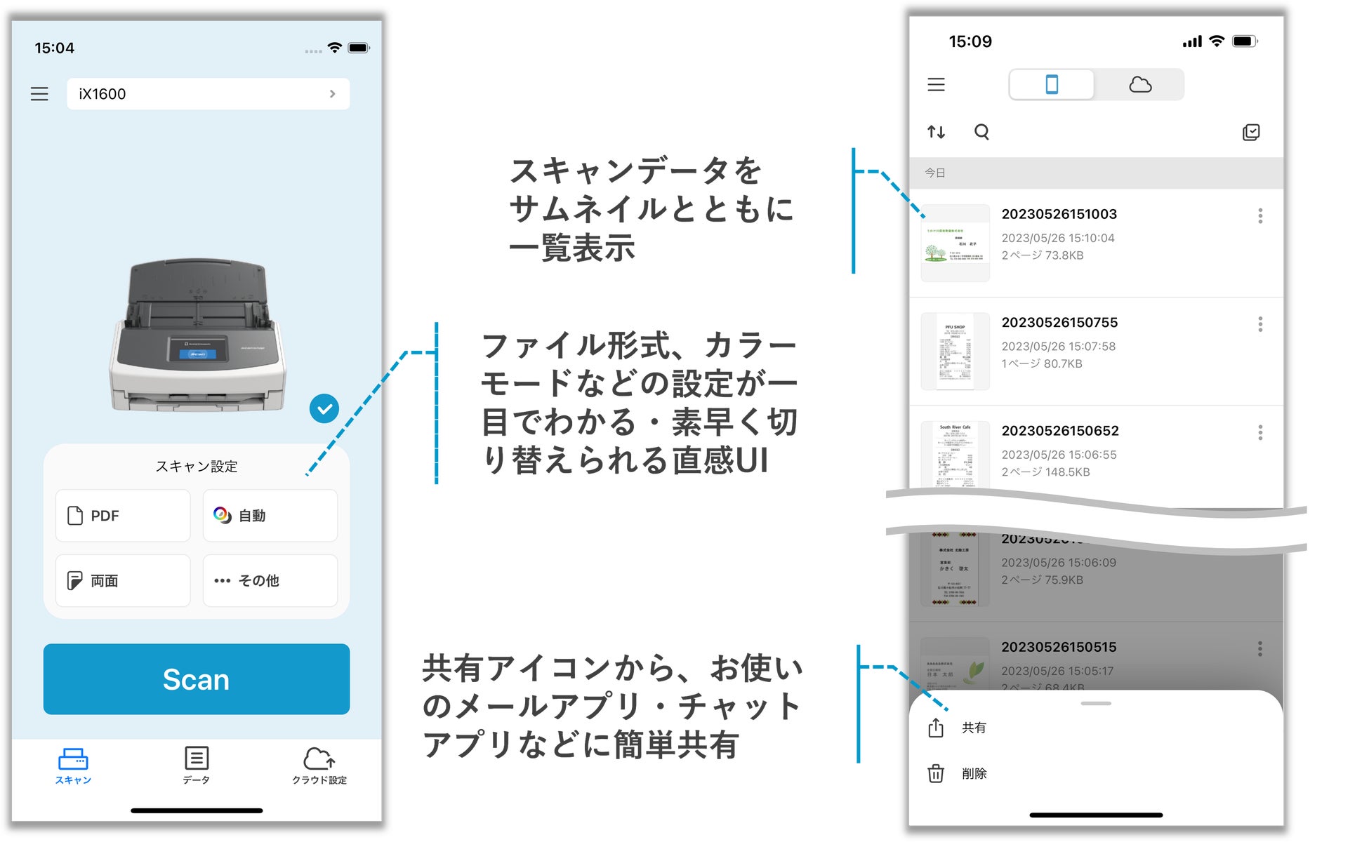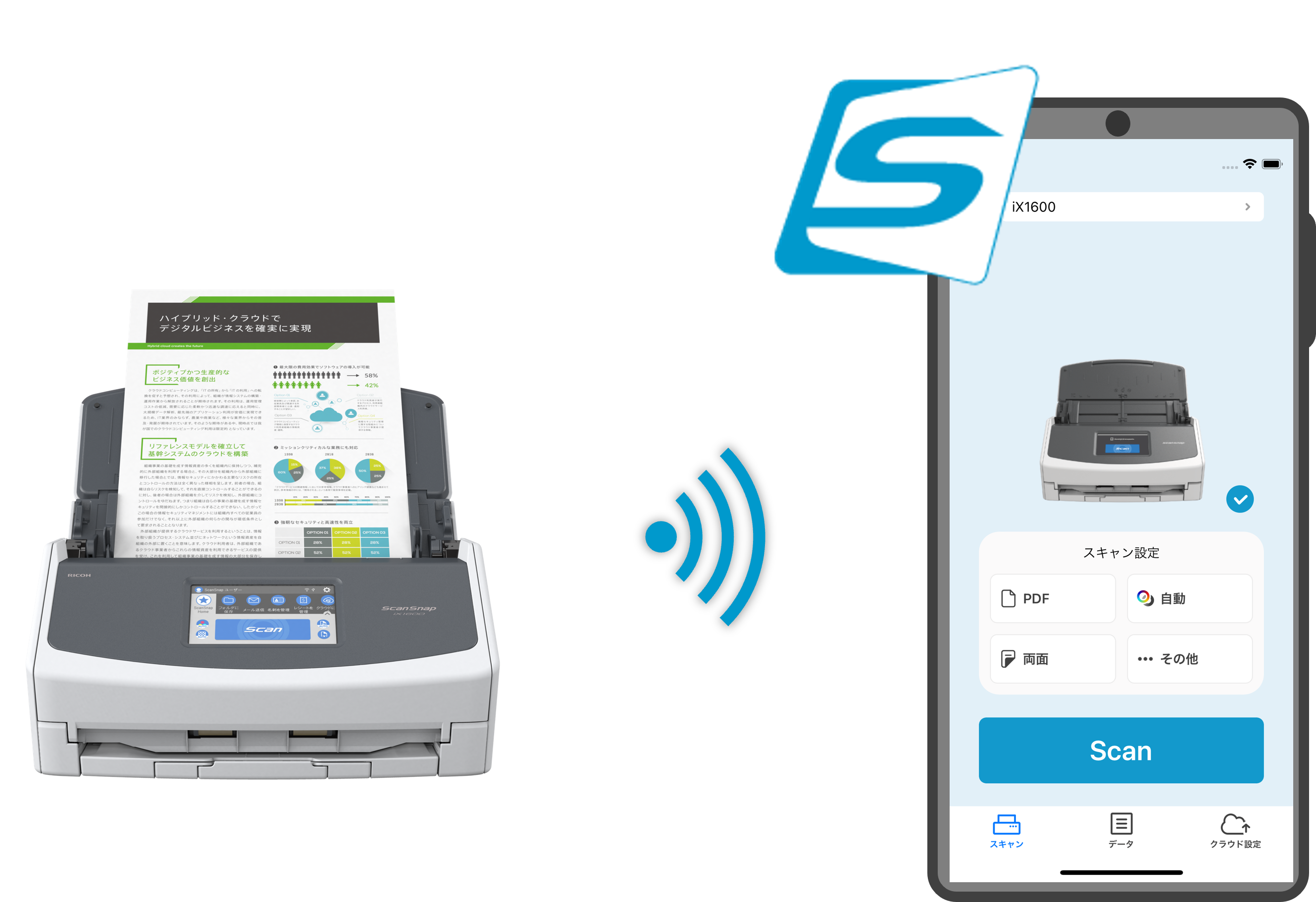 これまでのモバイル向けアプリ「ScanSnap Connect Application」と、スキャナーから直接クラウド連携できるサービスScanSnap Cloudの設定を行う「ScanSnap Cloudアプリ」の機能を統合。より使いやすい直感的なユーザーインターフェイスで、スキャンやクラウド設定を行えます。従来のモバイルアプリのスキャンデータは、モバイル版ScanSnap Homeに引継ぎ可能です。(注1)(従来のモバイルアプリは2024年8月頃に提供終了予定)