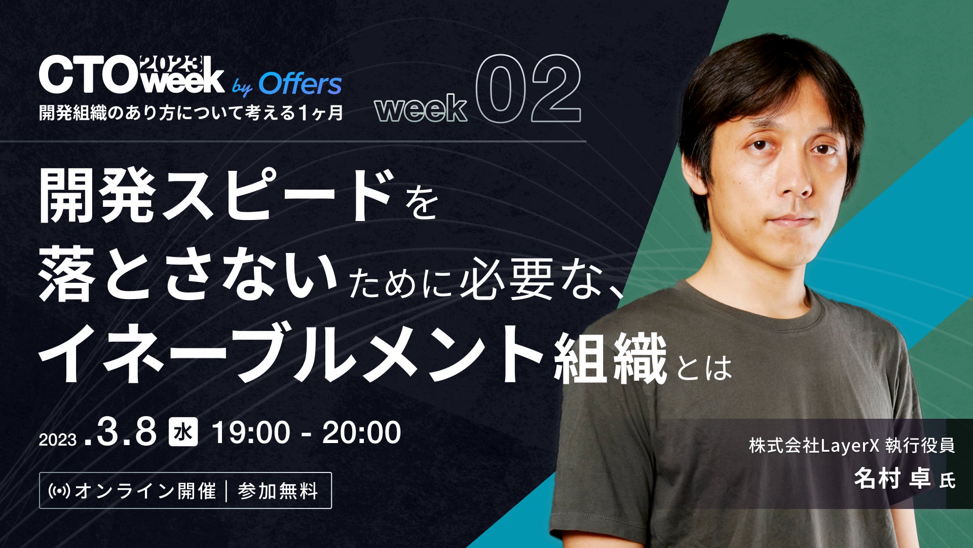 ITエンジニア/デザイナーの副業・転職サービス「Offers(オファーズ)」を運営する株式会社overflow(本社:東京都港区、代表取締役: 鈴木裕斗・田中慎 以下、overflow)は、開発組織のマネージメント担当者に向けたイベント「CTOWeek 2023 by Offers」の第2回に、株式会社LayerX 執行役員 名村 卓(なむら すぐる)氏の登壇が決定したことをお知らせします。