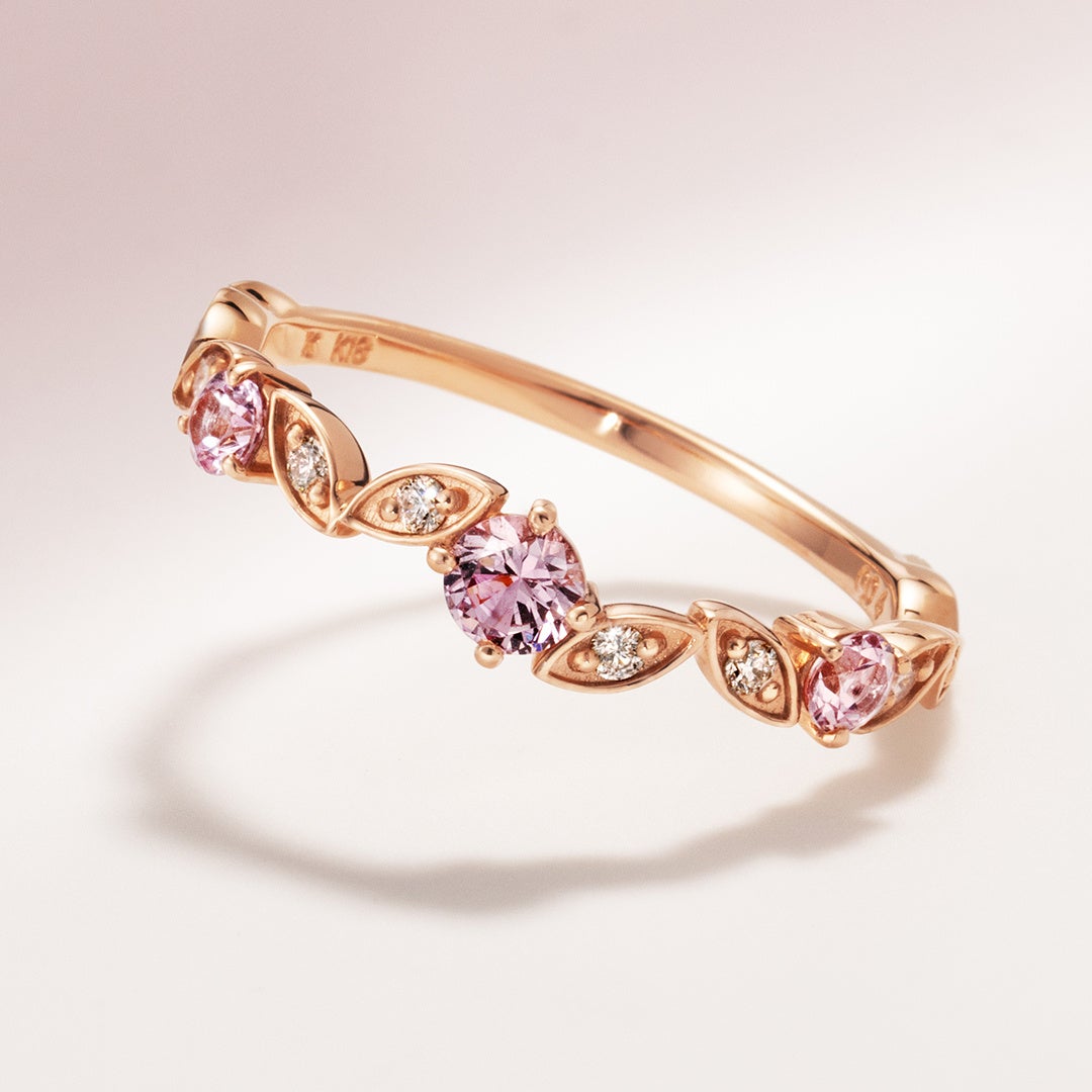 風にそよぐ葉と、やわらかなピンクのきらめきをイメージしたリング。ニュアンスカラーが魅力の「シャンパンガーネット」を3石あしらい、精緻なシルエットに落とし込みました。ほんのりベージュを含んだモーブピンクは、落ち着きのある華やかさが特徴。連なる葉のモチーフが瑞々しい輝きを引き立て、上品で洗練された印象を演出します。