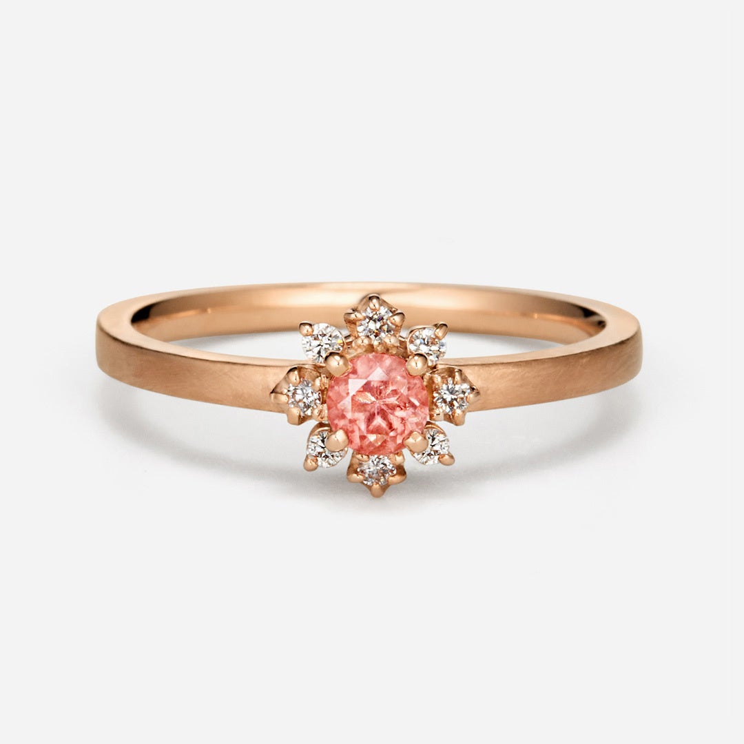 透明度と発色に優れたアメリカ産ロードクロサイトを厳選し、8石のメレダイヤで取り巻いた「フルリッテ」。内側から光が湧くような蛍光感と奥行きある薔薇色を備えたルースのみを厳選しました。華やかなダイヤの取り巻きが、その美色を一層引き立てます。