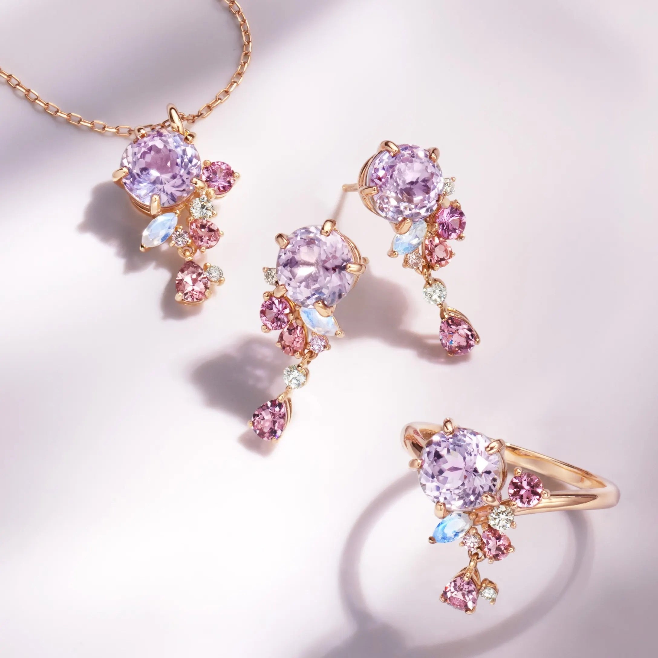 サイズの異なる宝石を組み合わせ、繊細な色の濃淡と奥行きのある表情を表現。トルマリンならではのやさしい煌めきが、春らしい上品な甘さを添えます。