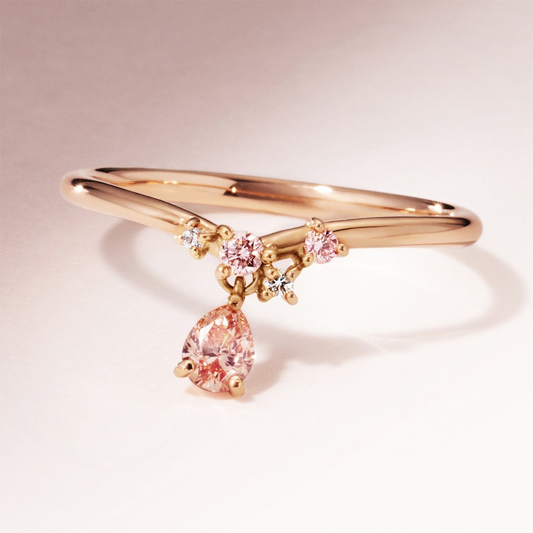 うららかな春の日差しと、風に舞う桜の情景から着想を得たリング。揺らめくペアシェイプのラボグロウン・ピンクダイヤモンドを主役に、5石のダイヤモンドを配し、軽やかな動きと奥行きのある表情を表現しました。繊細なピンクのグラデーションと、ダイヤモンドならではのみずみずしい煌めきが調和し、刹那的な自然の美しさを指元に映し出します。