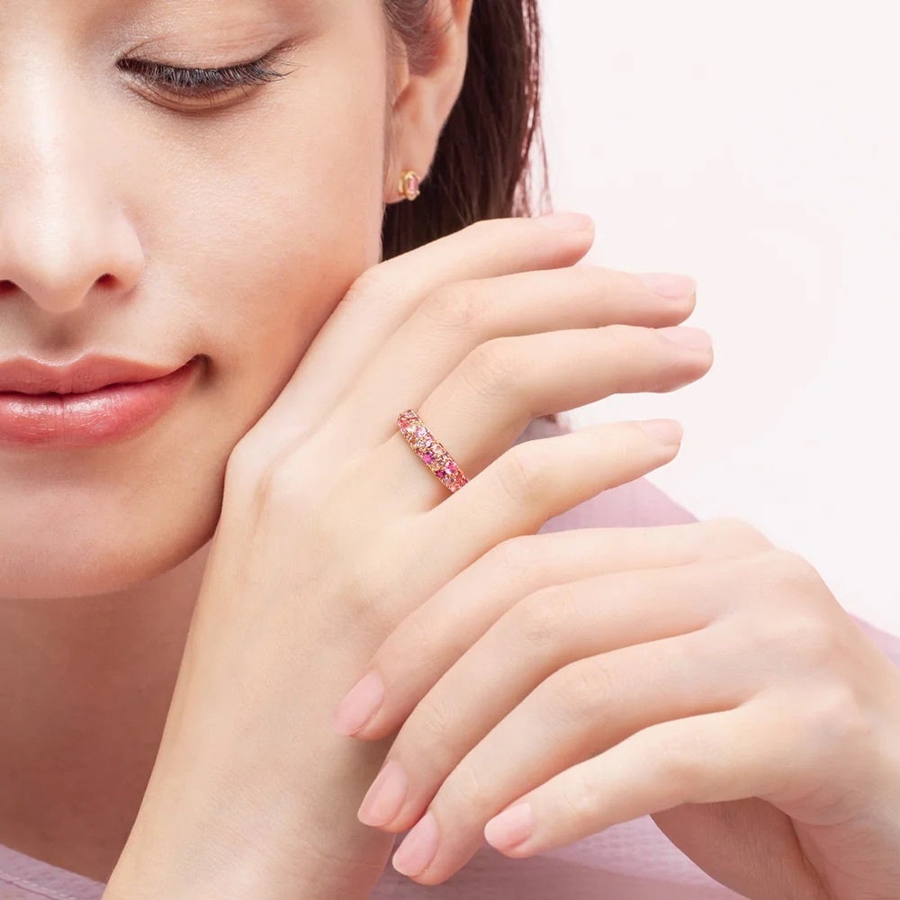 カラーエタニティシリーズ「エマ」より、世界三大希少石のひとつでもある「パパラチアサファイア」が登場します。ピンクとオレンジが溶け合う繊細なニュアンスカラーの宝石を厳選し、宝石が指を覆うような圧巻の華やぎを叶えました。
