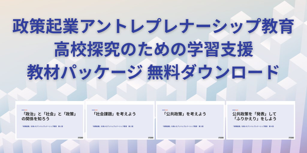公益財団法人国際文化会館 政策起業家プラットフォーム(東京都港区、理事長 近藤 正晃ジェームス、以下、PEP(ペップ): Policy Entrepreneur’s Platform)は、一般社団法人 Fora(東京都中央区、代表理事 藤村琢己) の協力のもと、高校の「探究」などの授業で活用できる教材「政策起業アントレプレナーシップ教育 高校探究のための学習支援教材パッケージ」(以下、本教材)を開発し、Web 上で無料公開しました。本教材は、政策立案を通じて社会課題を解決する「政策起業」の手法を学習し、生徒がアントレプレナーシップを身につけることを目指しています。社会や公共の授業で学ぶ知識とアントレプレナーシップ教育をつなぎ、より多くの教育現場で実践的な学びを促すことが目的です。
