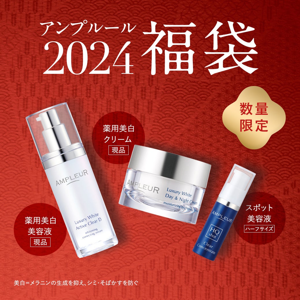 お得な「福袋 2024」には、アンプルールの美白(*1)ケアが実感できる3つのアイテムをセット。シミ(*2)やくすみ(*3)の目立たない、透明感あふれる肌へ導きます。