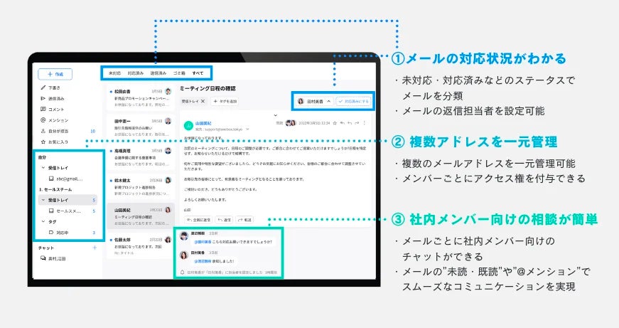 メール対応の効率化から始めるAI DXツールです。AIエージェントと協働し、問い合わせ対応・顧客管理・一斉送信などをワンストップで実行できます。