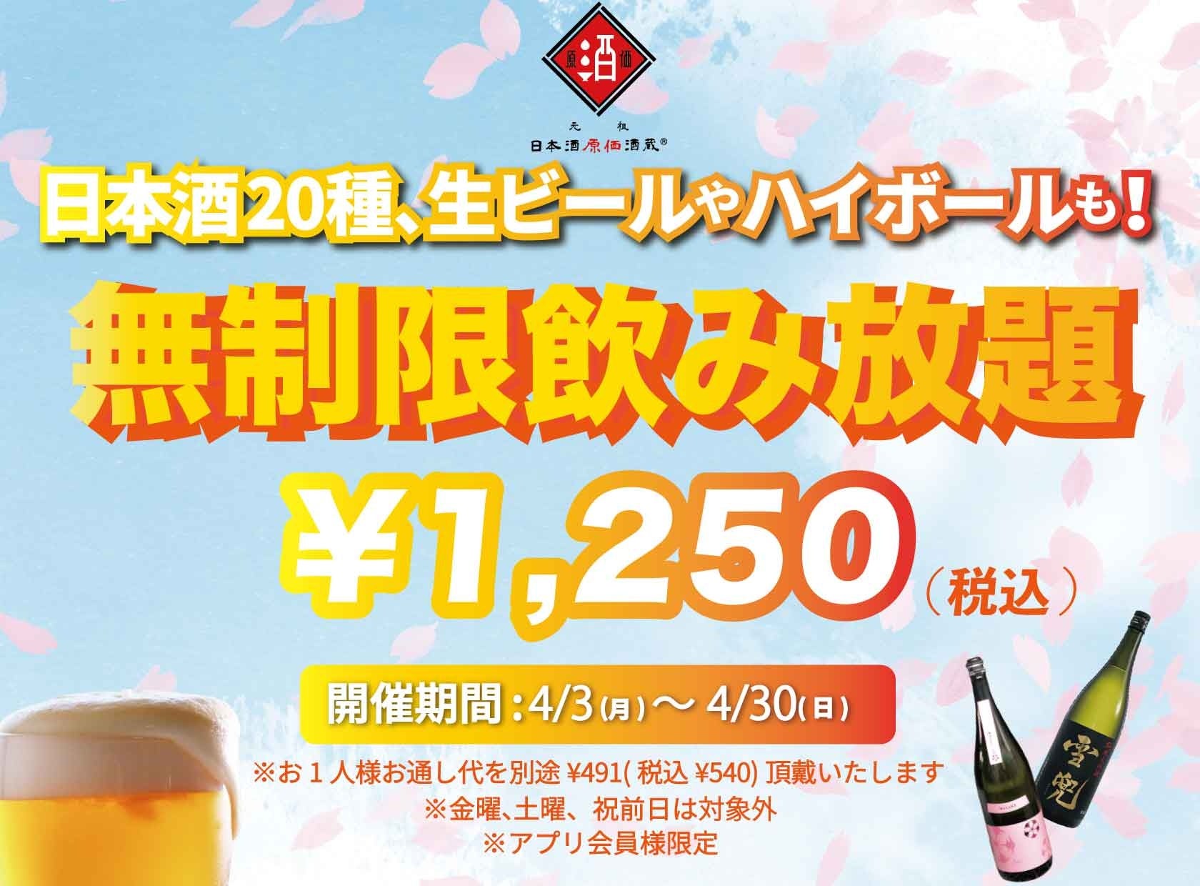 株式会社クリエイティブプレイス(本社:東京都品川区 代表:中村雄斗)が運営する日本酒原価酒蔵では、全店舗にて4月3日(月)~4月30日(日)の期間、時間無制限飲み放題¥1,250(税込)~を開催します。※日曜~木曜日、1日30名様限定