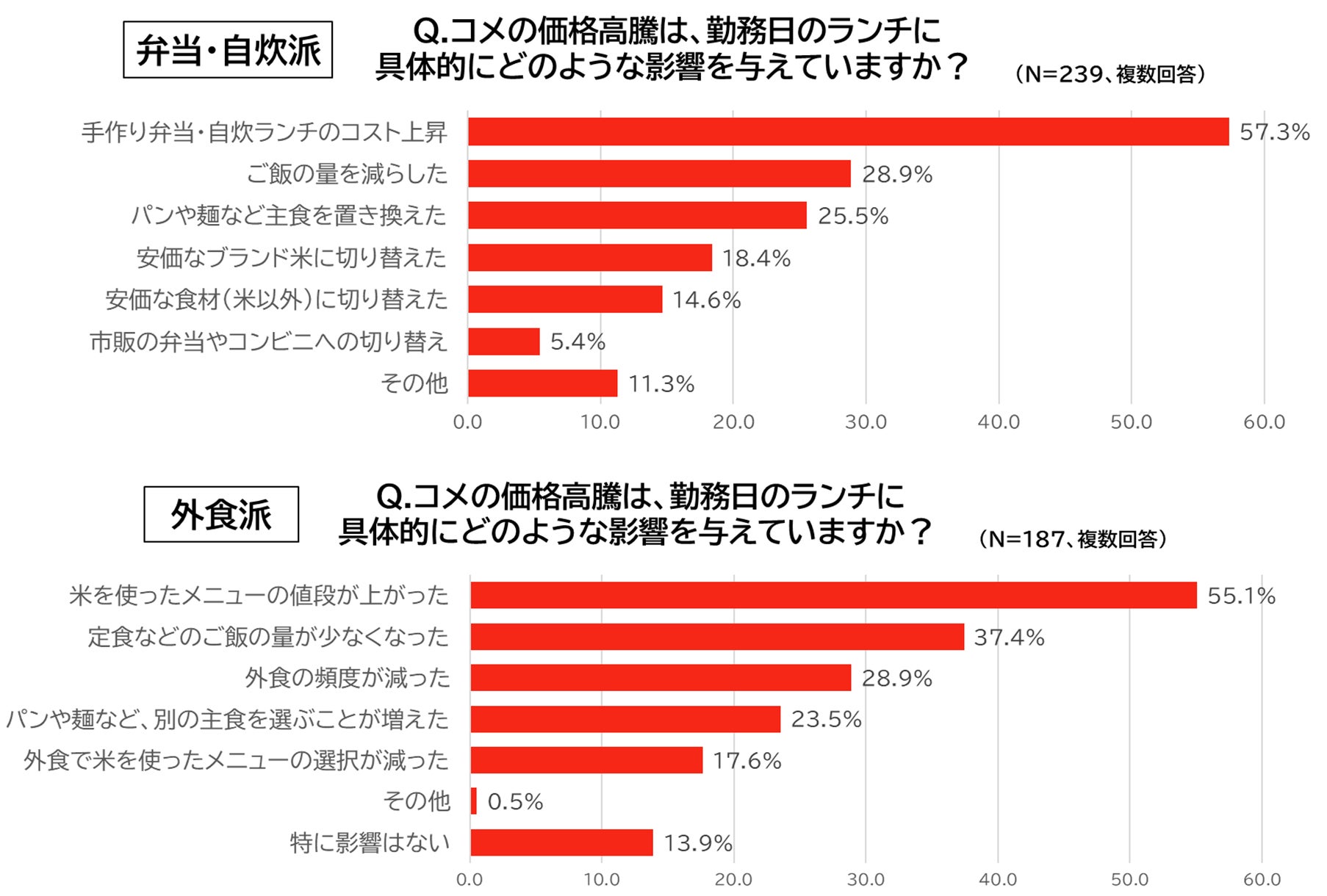 次にコメ高騰のランチへの影響を実感している人を対象に、弁当・自炊派と外食派それぞれに、具体的な影響について尋ねました。弁当派では、材料費のコスト上昇以外にも、約3割(28.9%)が「ご飯の量を減らした」と回答し、4人に1人が主食をパンや麺などに置き換えていることも明らかになりました。また、外食派では、「米を使ったメニューの価格上昇」以外にも、約4割が「定食などのご飯の量が減った」と実感しており、約3割が「外食頻度が減った」と回答しています。こうした結果からも、コメの価格高騰が、日々のランチ内容や選択肢そのものに大きな影響を与えていることが分かります。