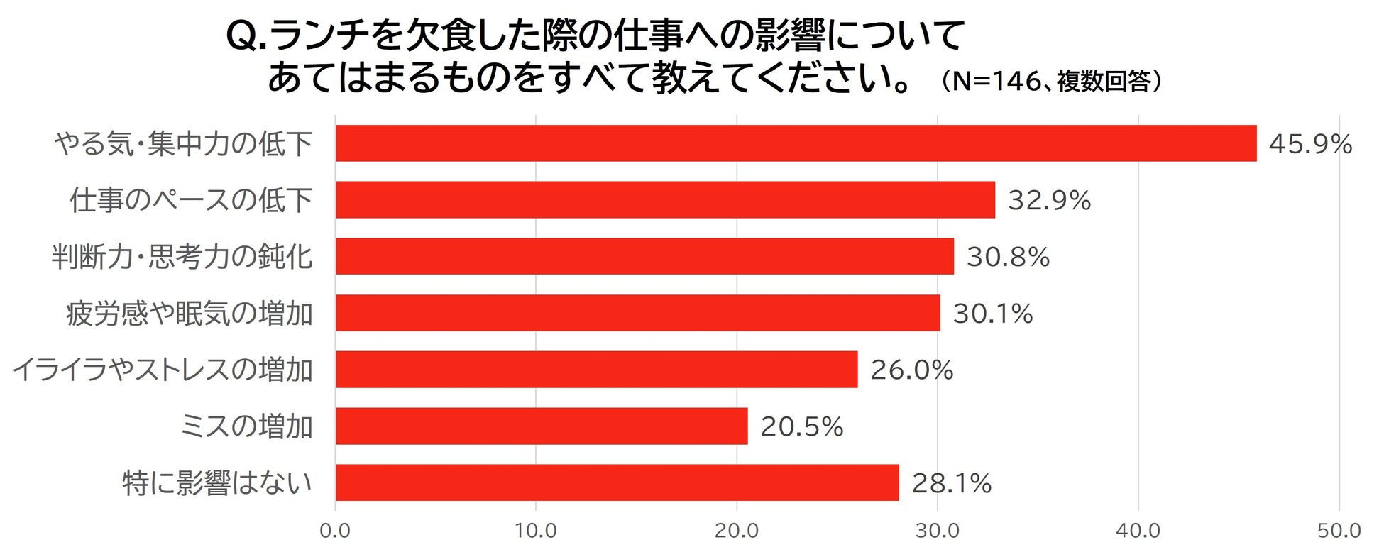 さらにランチを食べない人に仕事へどのような影響があるか聞いてみると、7割以上の人が悪影響を実感しており、「やる気・集中力の低下(45.9%)」との回答が最多となりました。続いて、3人に1人が「仕事のペースの低下」「判断力・思考力の鈍化」を挙げており、ランチを抜くことが単に空腹感を生むだけでなく、業務パフォーマンス全体に影響を及ぼしている実態が浮き彫りに。ランチを適切にとることが、業務効率や生産性を維持する上でも重要な要素であることがうかがえます。