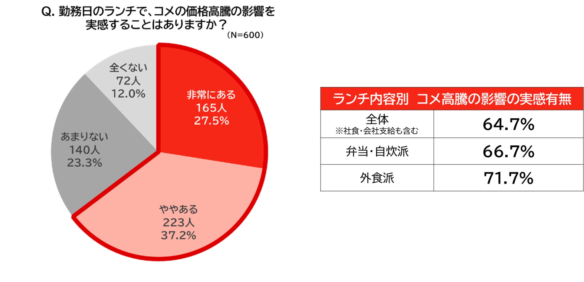 ランチへの影響を実感することがあるかを聞いたところ、実に7割近く(64.7%)のビジネスパーソンが「非常にある/ややある」と回答。弁当・自炊派/外食派(※)ともに大きな差は見られず、コメ高騰の影響が幅広い層のランチに及んでいる実態が明らかとなりました。