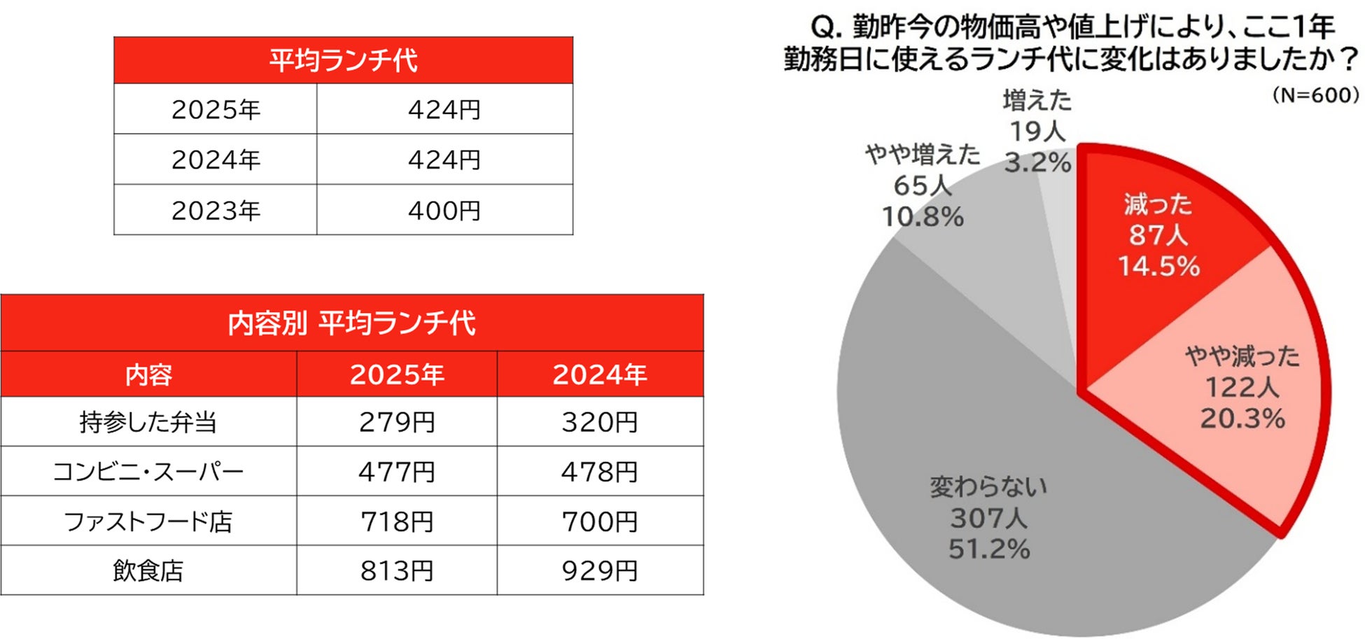 ランチ代の全体平均は昨年と同じ424円。外食費は依然高止まり