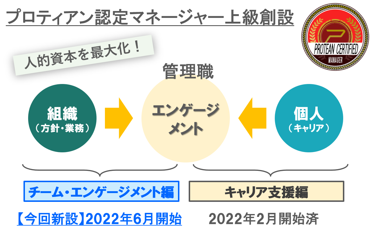 ※これまでの「プロティアン・マネジメント検定~キャリア開発支援編~」に加え、「プロティアン・マネジメント検定講座~チーム・エンゲージメント編~」にW合格することで、「プロティアン認定マネジャー上級資格」が付与されます。