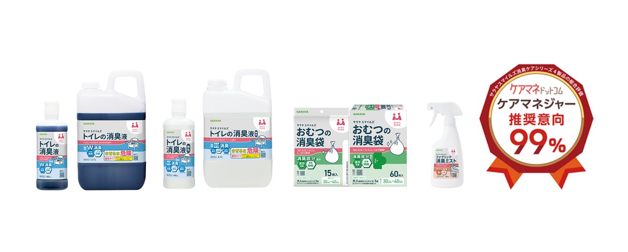 サラヤ株式会社(本社:大阪/代表取締役社長:更家悠介)は、シニアケアの総合ブランド「サラヤスマイルズ」の消臭ケアシリーズ4製品が、株式会社エス・エム・エス(本社:東京都港区/代表取締役社長:後藤夏樹)が運営するケアマネジャー向けコミュニティ「ケアマネドットコム」の商品評価サービスの第一号として「ケアマネジャー推奨意向99%」を獲得したことをお知らせいたします。
